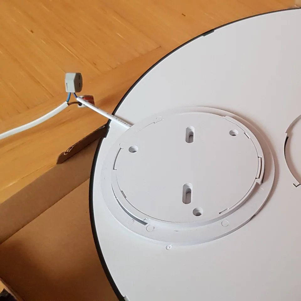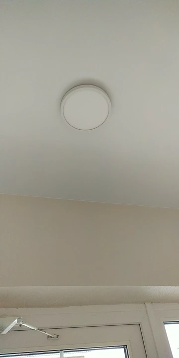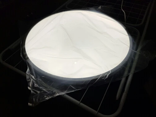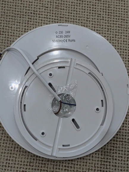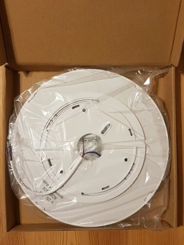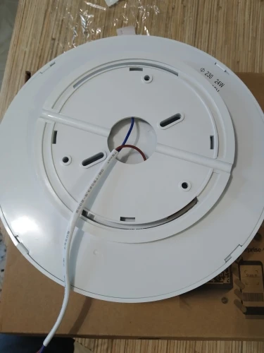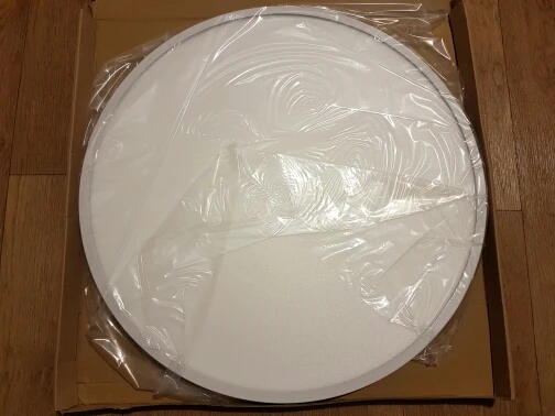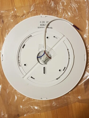Светильник прислали быстро. Упакован в родную коробку и пленку сверху, упаковка целая. Светильник абсолютно пластмссовый. Надеюсь насчёт отвода тепла китайские инженеры хорошо подумали. Крепится на потолок площадка с контактами, затем на неё надевается светильник и поворачивается до фиксации. Достаточно яркий, люксометра нет измерить нечем, наверное цветовая температура около 4000к. Нет неравномеиностей засветки плафона. Так все достойно выглядит. Разбирать нет нужды, все собрано на пластиковых зацепах. Остальное покажет эксплуатация