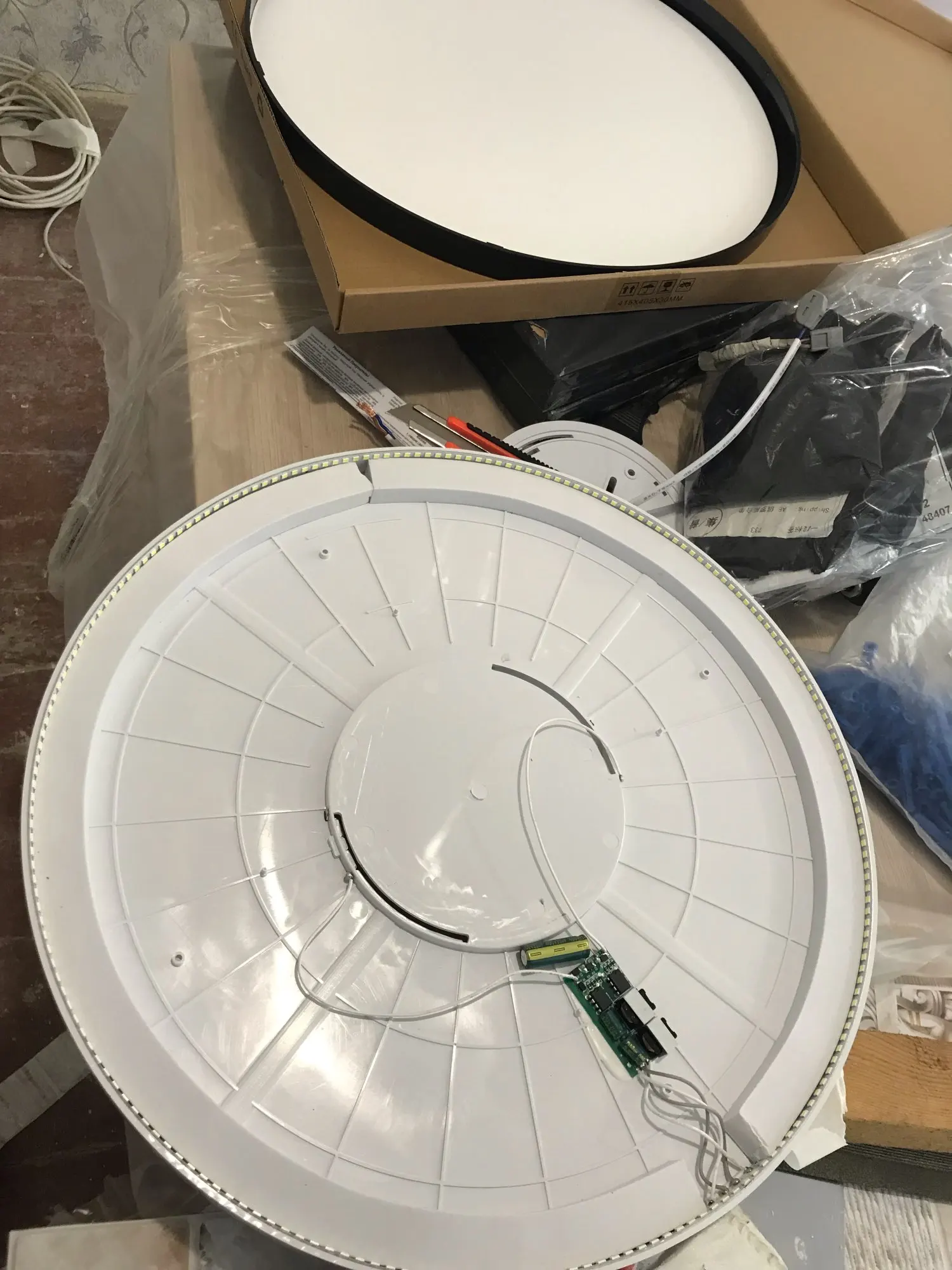 Доставка из России меньше недели, диодная лента по краю, греются не сильно и только по краю, увесистые, но пластиковые. Контакт между люстрой и базой плохой, надо подгибать. 2 светильника по 38 ват на комнату 20 метров света очень много, но к нему быстро привыкаешь. В целом очень доволен, брал с купонами и скидками за 1600 р.