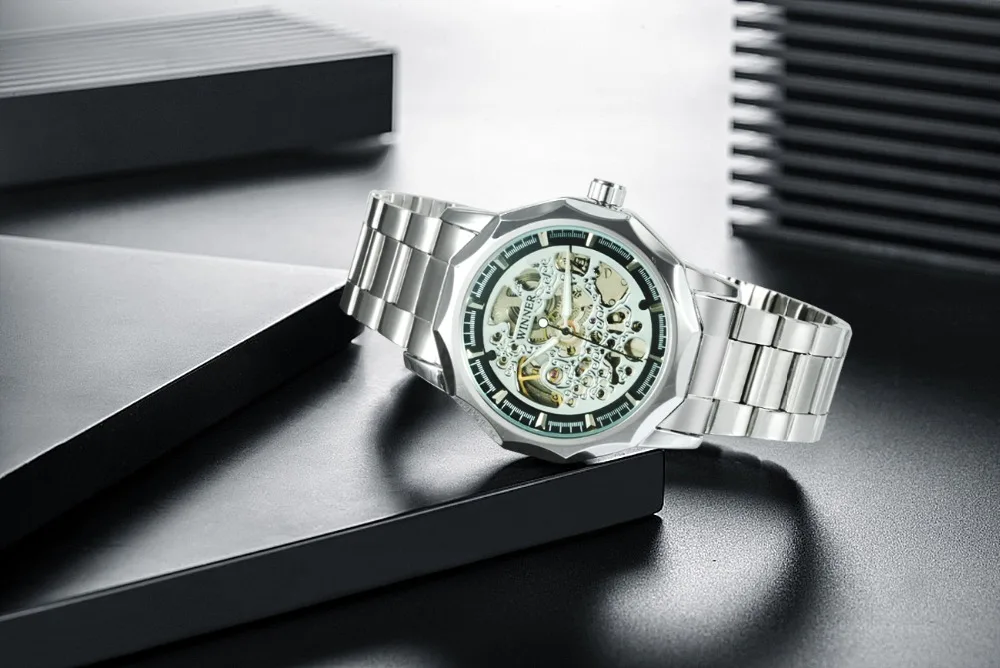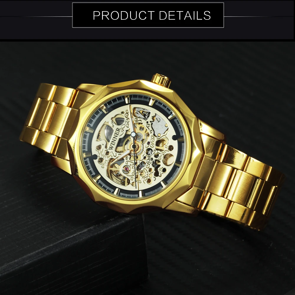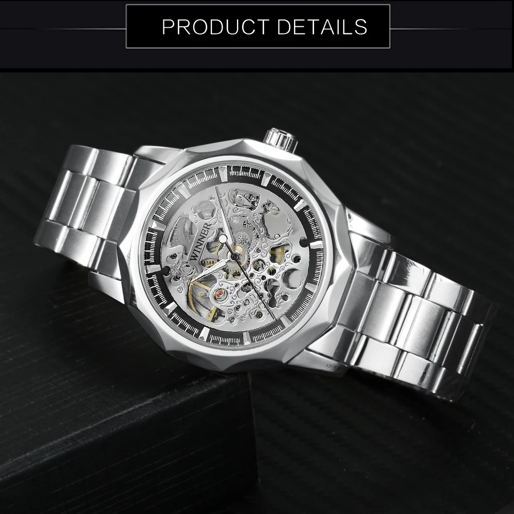 Мужские автоматические механические часы-скелетоны WINNER, золотистые и Серебристые Роскошные брендовые деловые классические большие часы с браслетом из нержавеющей стали