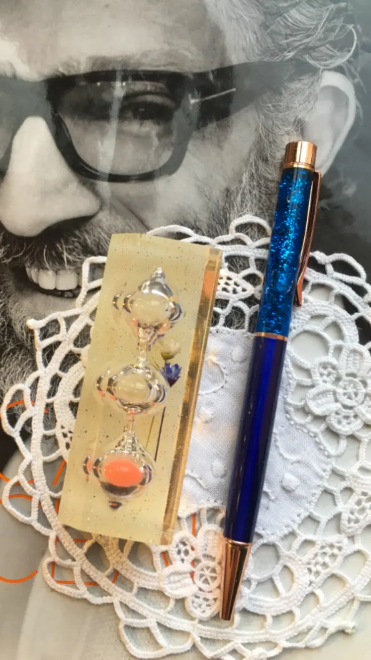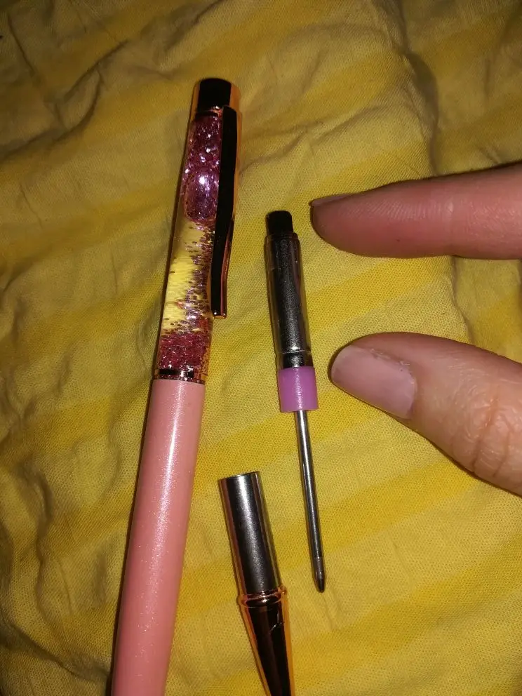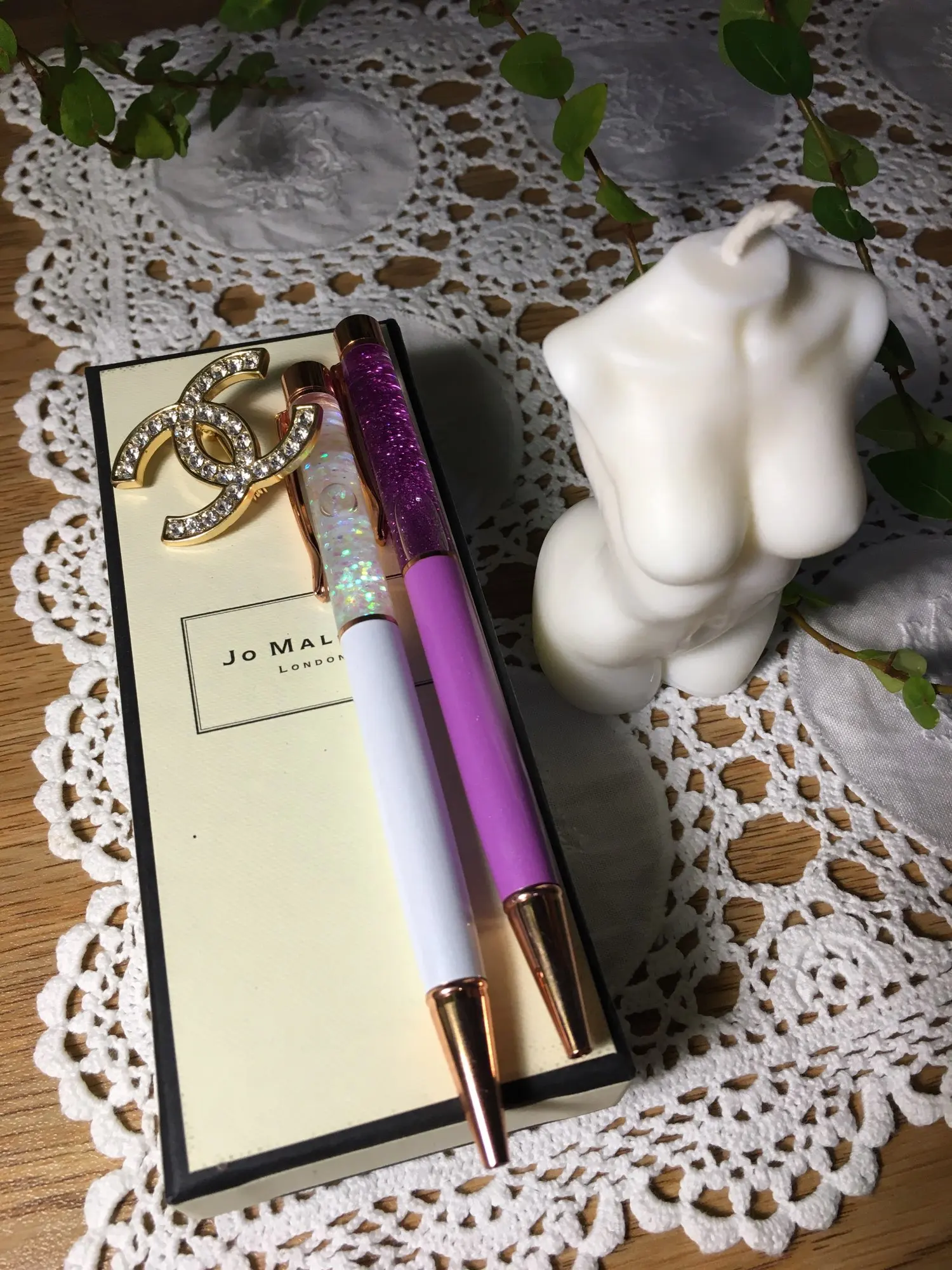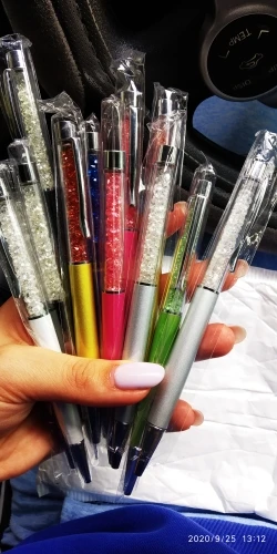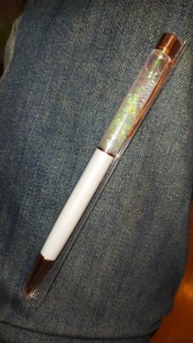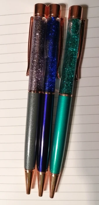 Exactly as pictured. Pens write well and don't skip. Ink is black. The glitter moves in the pen top like a snow globe. They look great in my office. Arrived very quickly in the US. I would recommend!