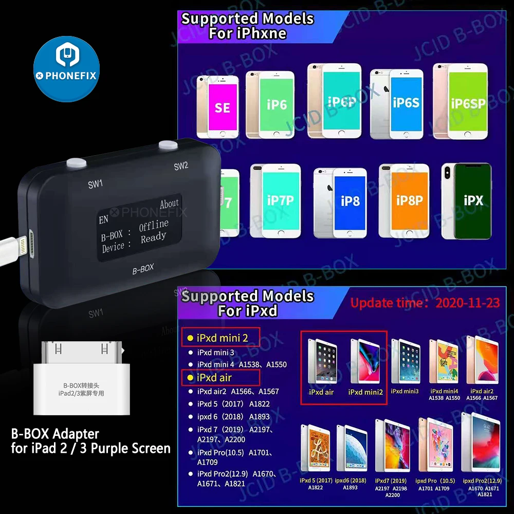 1. B-BOX поддерживает большинство полных моделей для всех устройств iOS от A7-A11, поддержка ipxne SE-X, iPxd mini 4, ipxd 5 / 6, ipxd Pro (10,5), ipxd PRO2 (12,9), iPad 2019 в настоящее время поддерживает больше моделей с помощью бесплатного обновления в будущем.