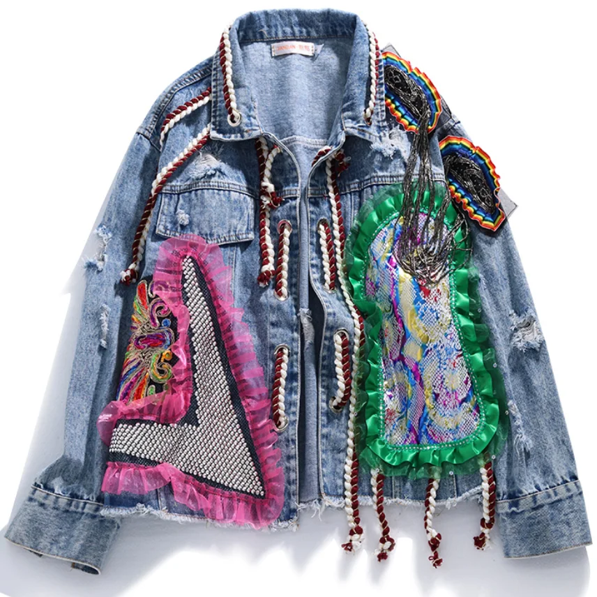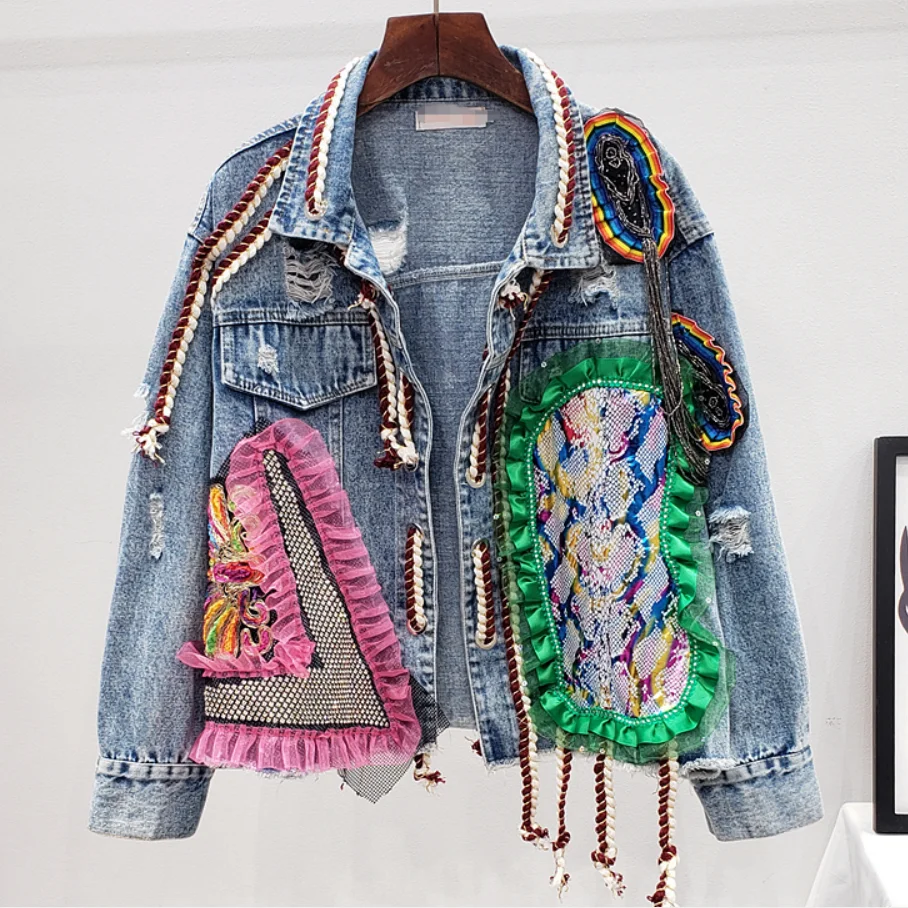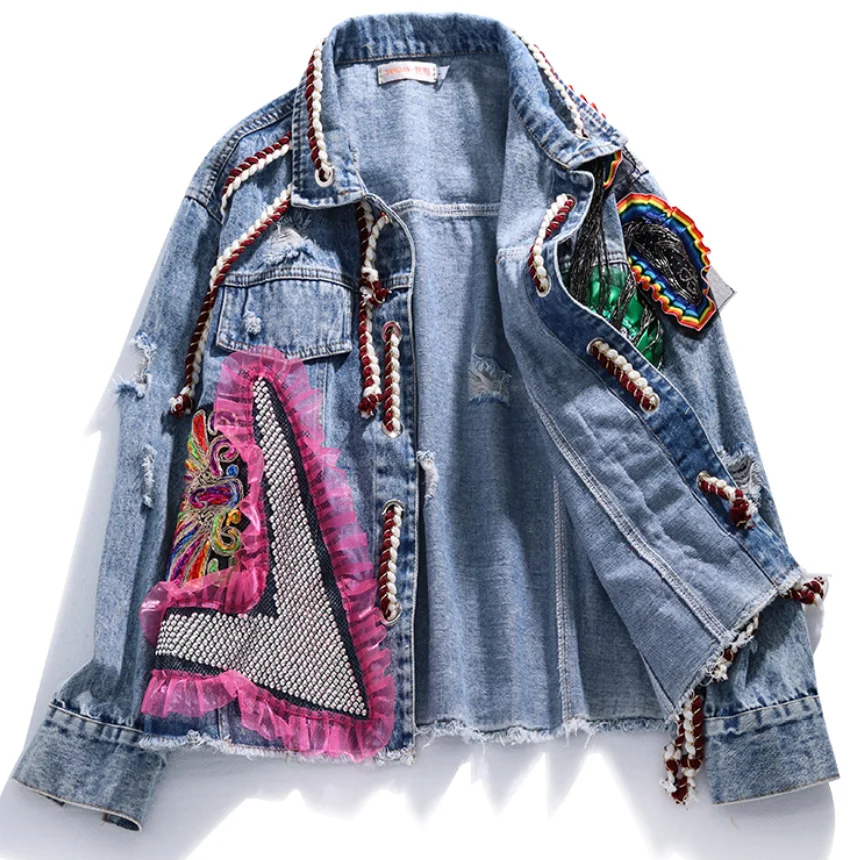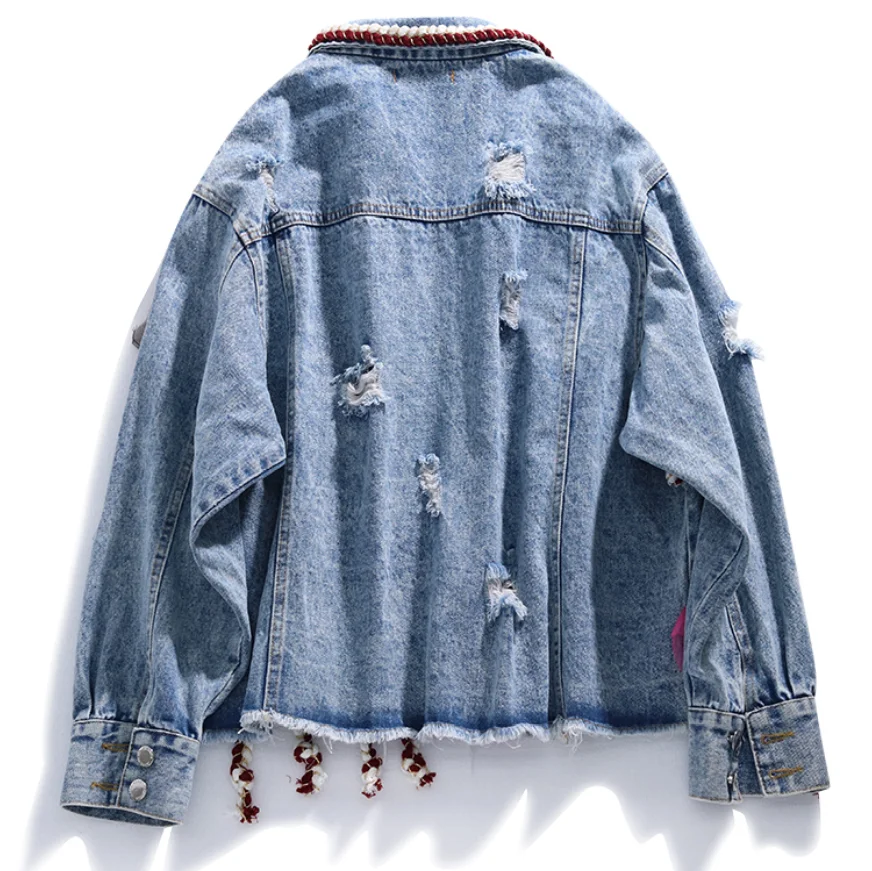 Женская джинсовая куртка-бомбер, короткий жакет с бриллиантами джинсы с бахромой, весна-осень