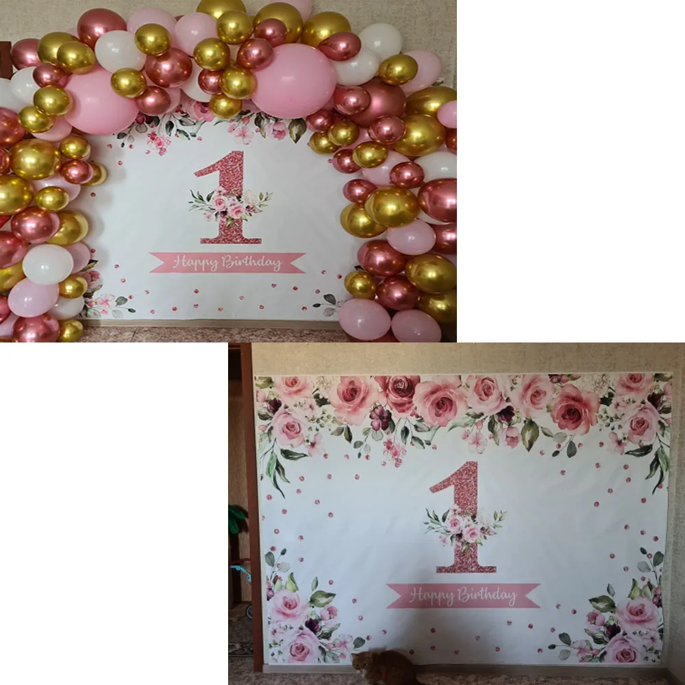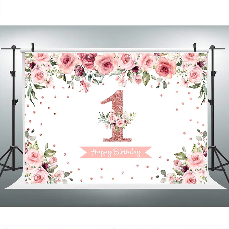 Фотографический фон для студийной фотосъемки с изображением девочки на первый день рождения цветы из розового золота