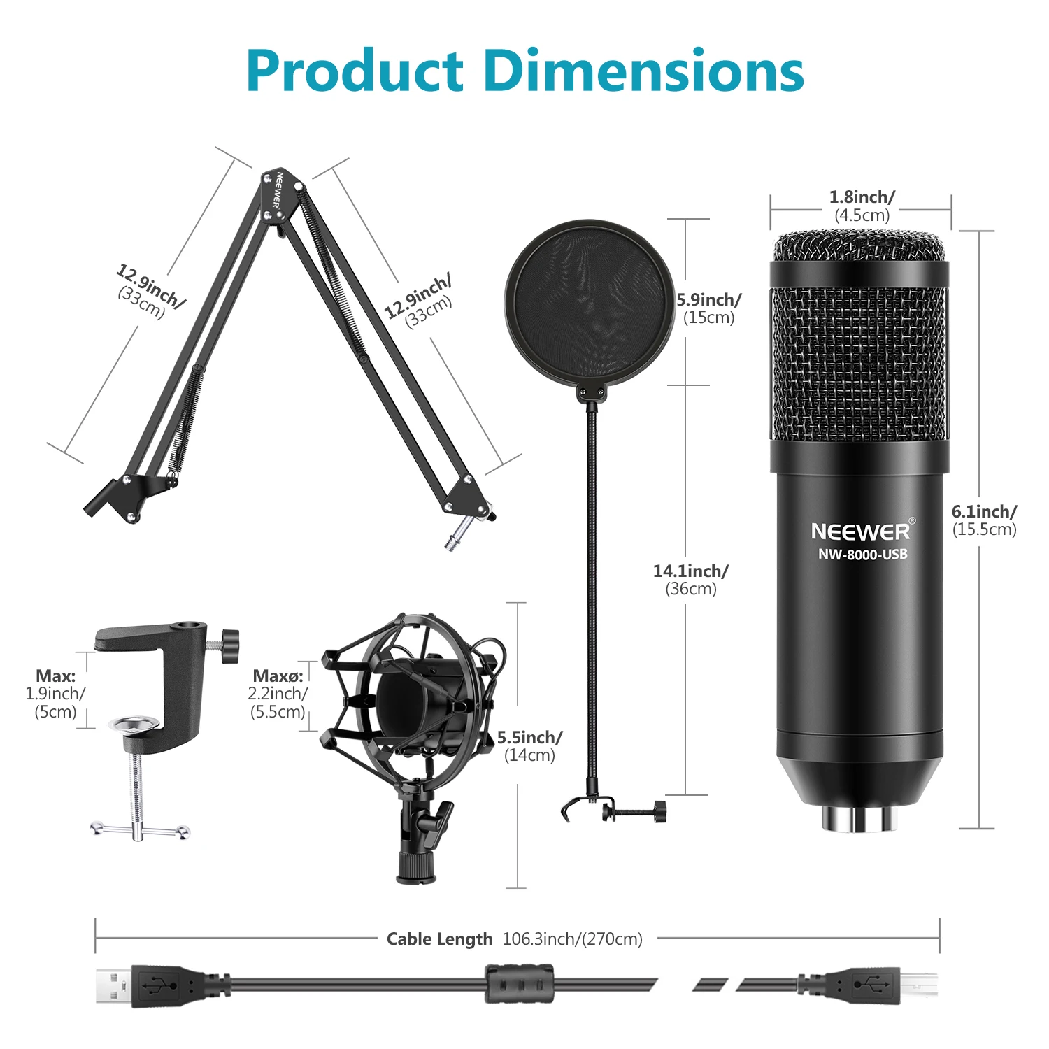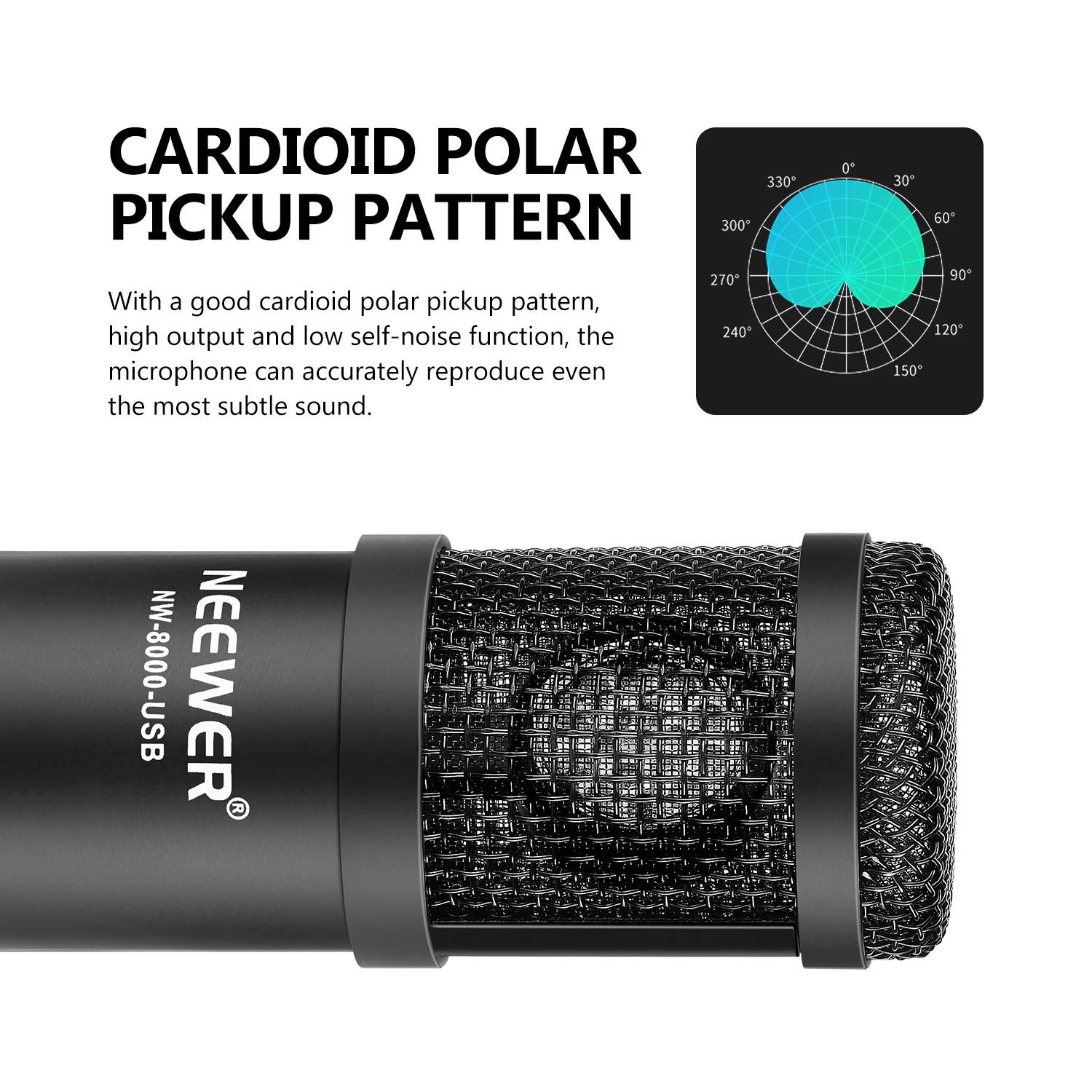 Neewer Модернизированный USB микрофон комплект с 25 мм Большой капсулой, 192 кГц/24 бит Plug & Play кардиоидный Подкаст конденсаторный микрофон с профессиональным звуковым чипсетом для домашней/студийной записи, игр, потоковой передачи (NW-8000-USB)