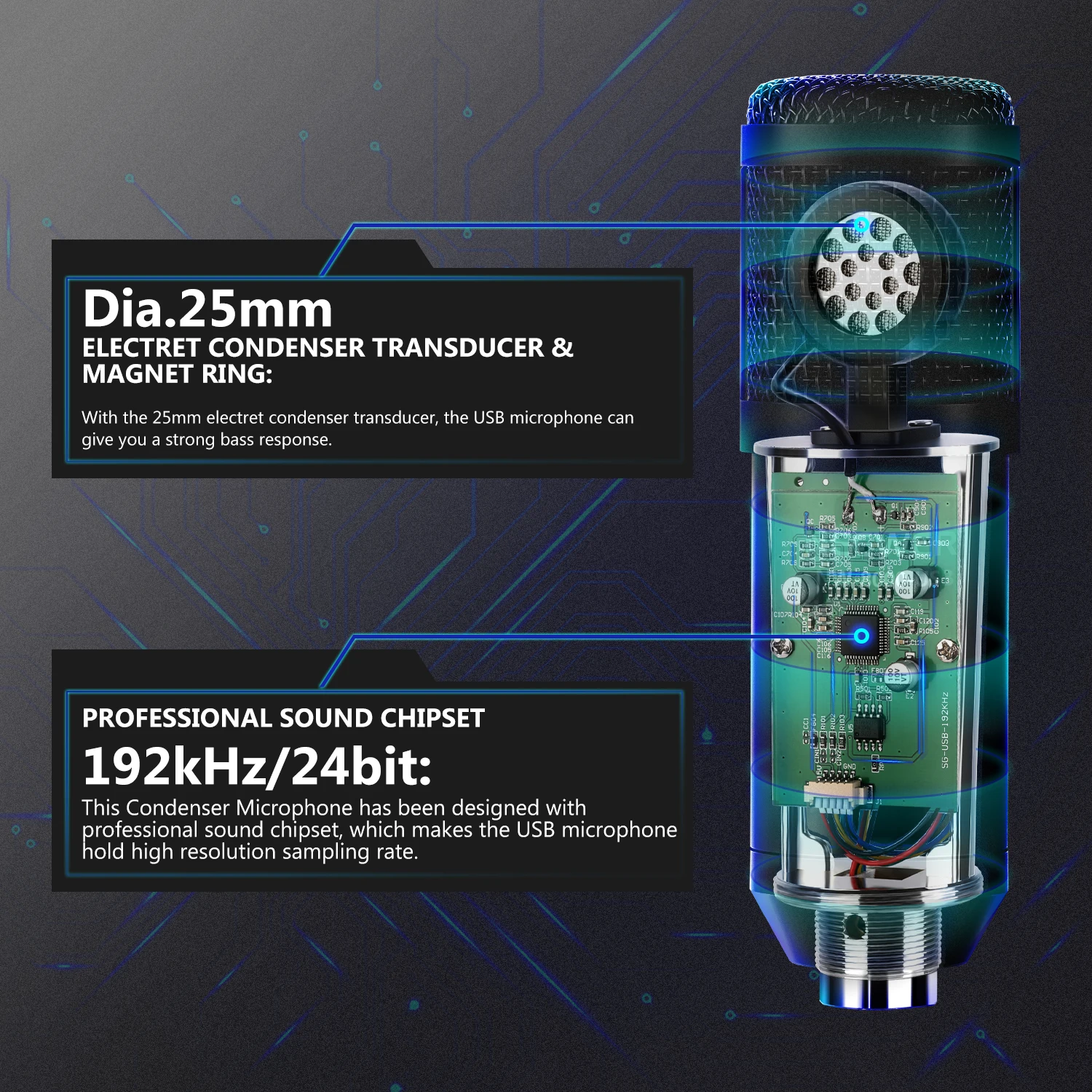 Профессиональный звуковой чипсет 192 кГц/24 бит: Этот конденсаторный микрофон был разработан с профессиональным звуковым чипсетом, что делает USB микрофон держать высокое разрешение дискретизации. Частота дискретизации: 192 кГц/24 бит. Гладкие, плоские амплитудно-Частотная характеристика: 30 Гц-16 кГц: расширенный диапазон воспроизводимых частот отлично подходит для пения, речи и голоса за. Дизайн кардиоидного полярного узора помогает уменьшить звуковые сигналы со сторон, улучшая изоляцию желаемого источника звука, делая более четкий и реалистичный звук