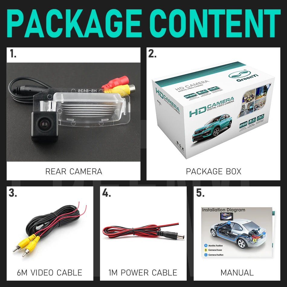 1. Камера траектории заднего вида2. Саморезы и коробка3. Видео кабель 6 м4. Кабель питания5. Руководство пользователя