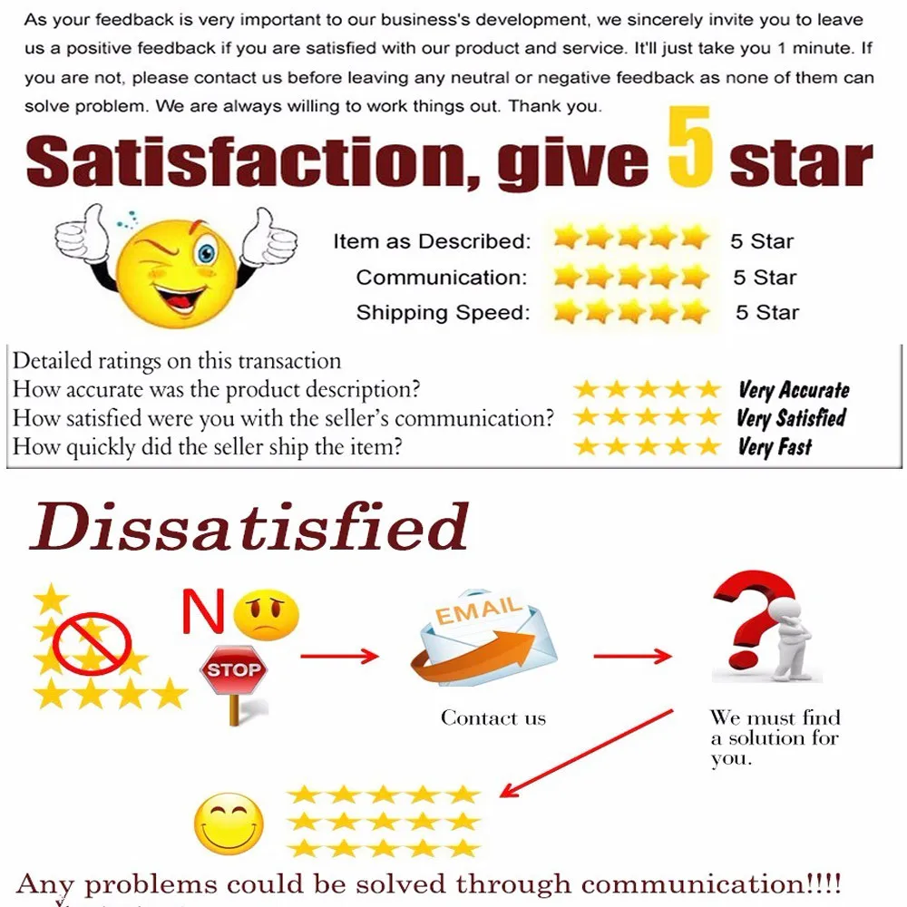 Мы очень рады работать для вас, и все наши усилия направлены на то, чтобы получить все больше и больше лучшего обслуживания для поддержки ваших потребностей в платьях или бизнесе. Поэтому ваши любезные и удовлетворенные комментарии очень важны для нас, и это определенно поможет нам обоим в будущем бизнес-сотрудничестве. И ваши быстрые положительные отзывы будут высоко оценены, большое спасибо.