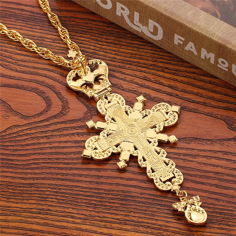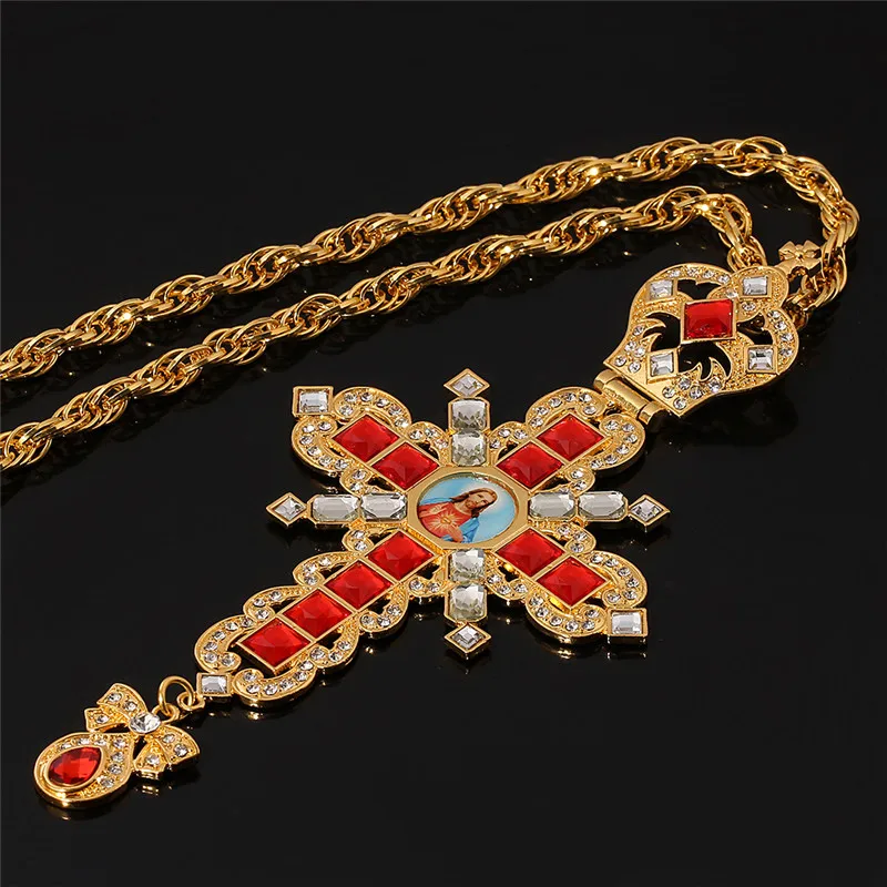 Ожерелье с подвеской золотого Креста, красные стразы с ортодоксальным распятием, ожерелья для монет для женщин, религиозное ювелирное изделие, длинное ожерелье с цепочкой
