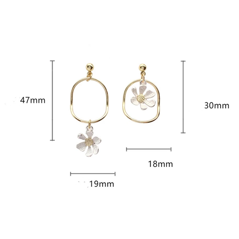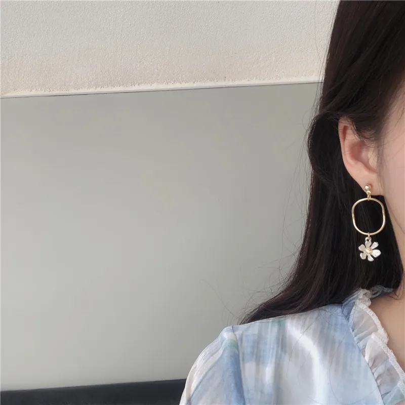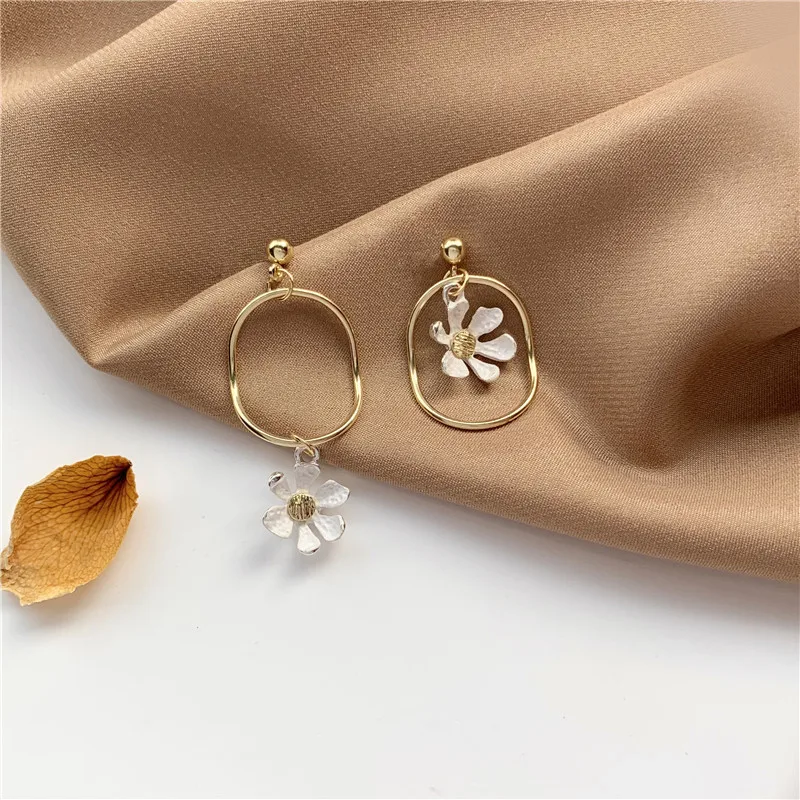 Милые асимметричные серьги-кольца из ажурного металла с белыми цветами, висячие серьги-подвески в Корейском стиле для женщин и девушек, Ювелирное Украшение