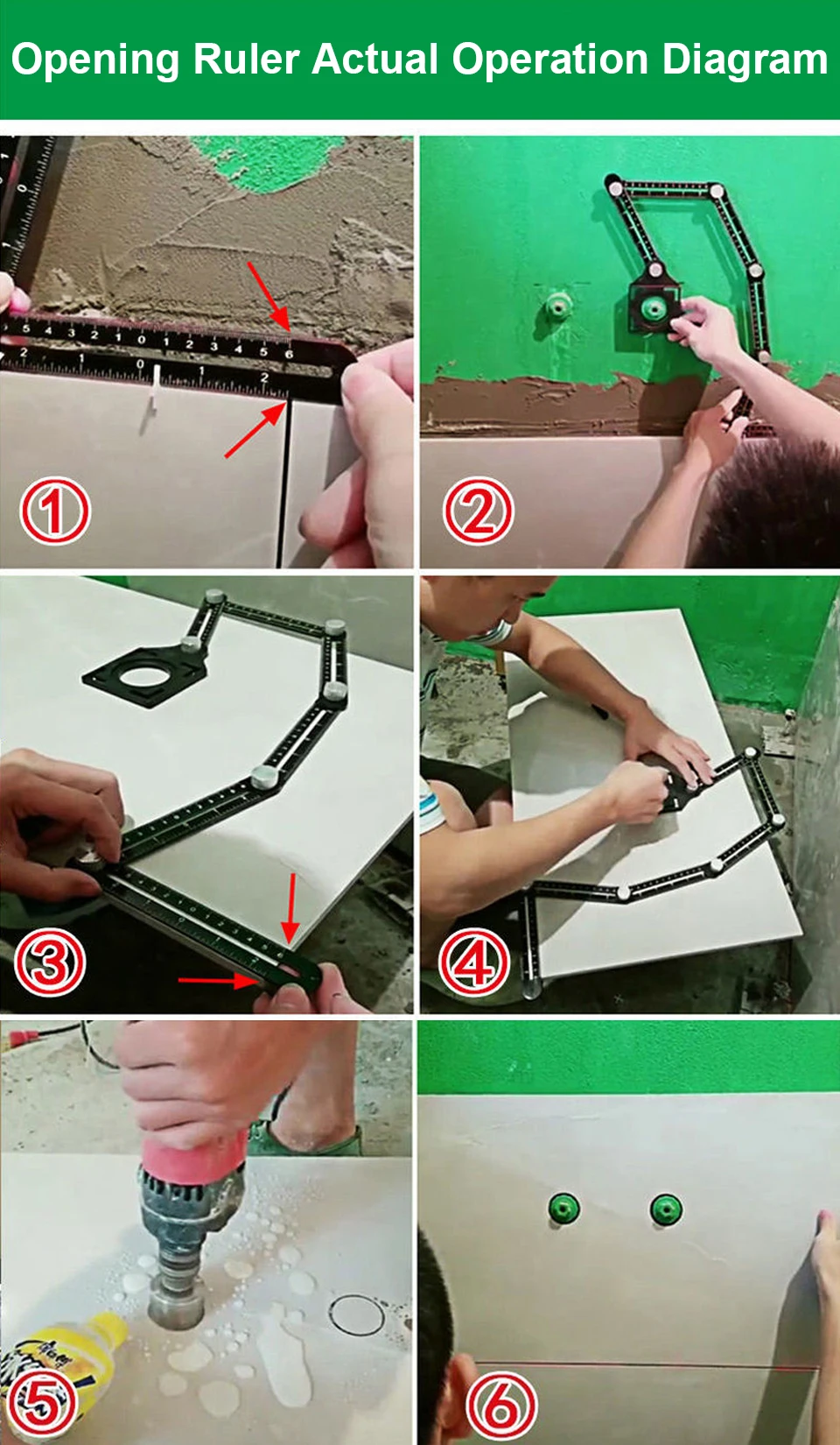 Горячие точки:1. Прочный и устойчивый к коррозии материал из алюминиевого сплава.2,6 конструкция складной линейки используется для измерения нескольких углов.3. Складной дизайн удобен для переноски и хранения.4. Идеально подходит для позиционирования и открытия керамической плитки.5. Простота в эксплуатации, форма линейки может быть легко отрегулирована.6. Он имеет несколько функций, таких как создание макета в плитке, кирпиче и дереве.Инструкции по использованию:1. Поместите его в рабочую область, сдвиньте линейку в нужную вам форму и затяните винты.2. Затем вы можете сделать идеальные измерения, и вы можете перенести и отследить его на любой материал.