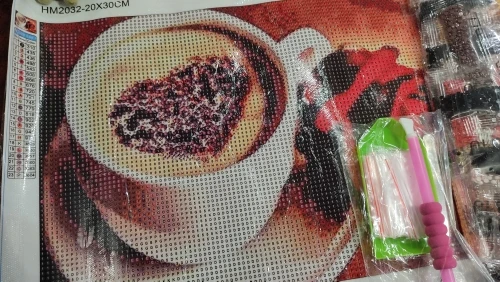 круглая алмазная выкладка полная, холст плотный. в наборе 23 цвета. идёт все в западных не удобных пакета, но есть маленькие ЗИП пакета что бы в дальнейшем переложить. стилус ярко розового цвета приятно удивил, обычно синий. пинцет плохой так лид бы был в наборе. силикон и ванночка салатового цвета.