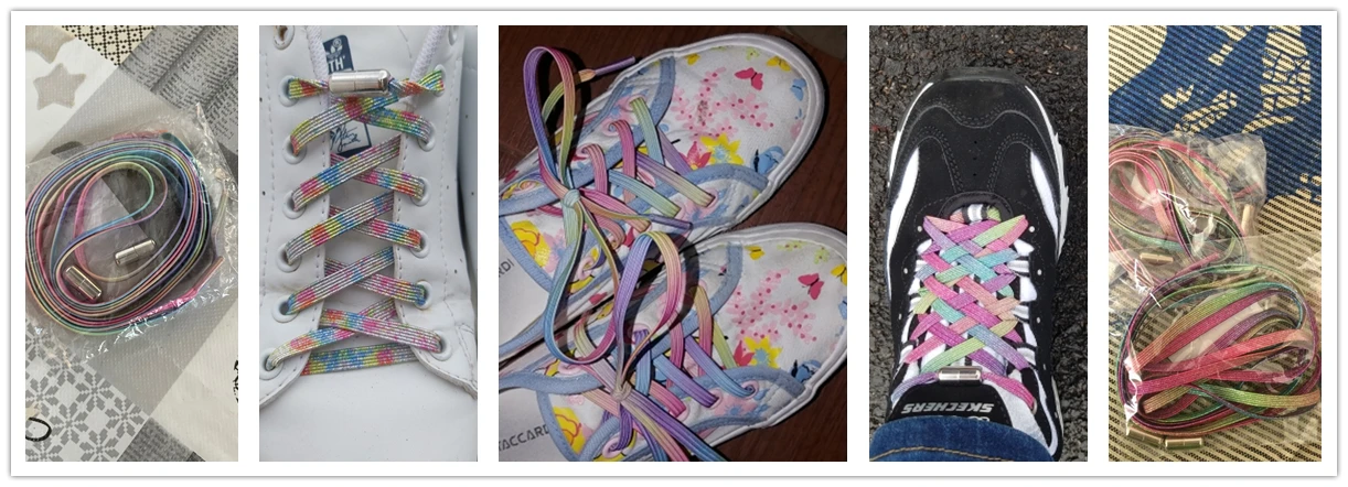 Очень симпатичные шнурки. Вставила в белые кроссовки, выглядят очень по-летнему и надевать-снимать удобно