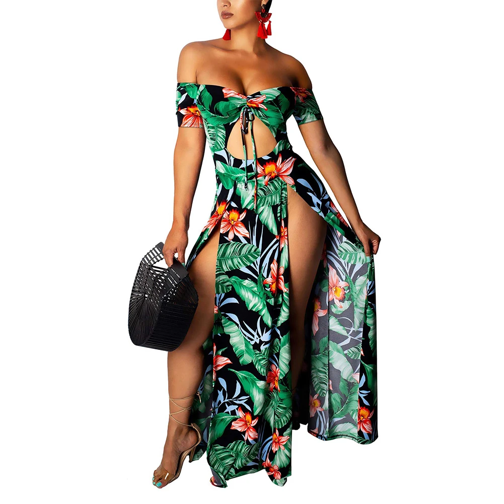 Женское платье в стиле бохо, летнее ажурное платье макси с цветочным принтом, открытыми плечами, глубоким V-образным вырезом и разрезом на подоле, праздничный Гавайский Сарафан