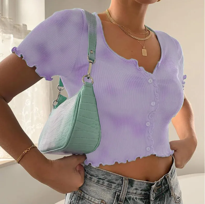 Женский модный топ в рубчик с V-образным вырезом и пуговицами --- этот Повседневный Топ с коротким рукавом подчеркивает любую фигуру, приталенный силуэт и подчеркивает привлекательность кроя. Наслаждайтесь ношением модного топа, не жертвуя комфортом, чтобы наилучшим образом соответствовать вашему вкусу и стилю.