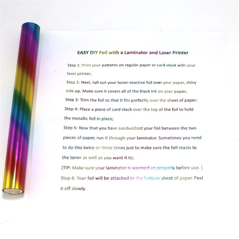С использованием метода:Легко DIY фольги с ламинатором и лазерным принтеромШаг 1: напечатайте ваши узоры на обычной бумаге или Карточном складе с помощью лазерного принтера;Шаг 2: Затем раскатайте фольгу с реактивной тонером на бумаге, блестящая сторона вверх. Убедитесь, что она покрывает все черные чернила на вашей бумаге;Шаг 3: Обрежьте фольгу так, чтобы она идеально прилегала к листу бумаги;Шаг 4: Поместите кусок карты на верхнюю часть фольги, чтобы держать металлическую фольгу на месте;Шаг 5: теперь, когда вы Зажмите фольгу между двумя листами бумаги, пропустите ее через ламинатор. Иногда вам нужно сделать это дважды или три раза, чтобы убедиться, что фольга реагирует на тонер так же хорошо, как вы хотите;(Совет: Перед использованием убедитесь, что ламинатор правильно разогревается.)Шаг 6: ваша фольга будет прикреплена к нижнему листу бумаги. Медленно удалите его.