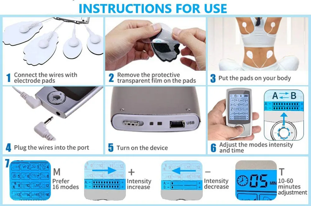 Устройство спроектировано так, что вы можете получить несколько выходов через 4 проводящие многоразовые прокладки (2 маленьких + 2 больших) и не нужны гели.