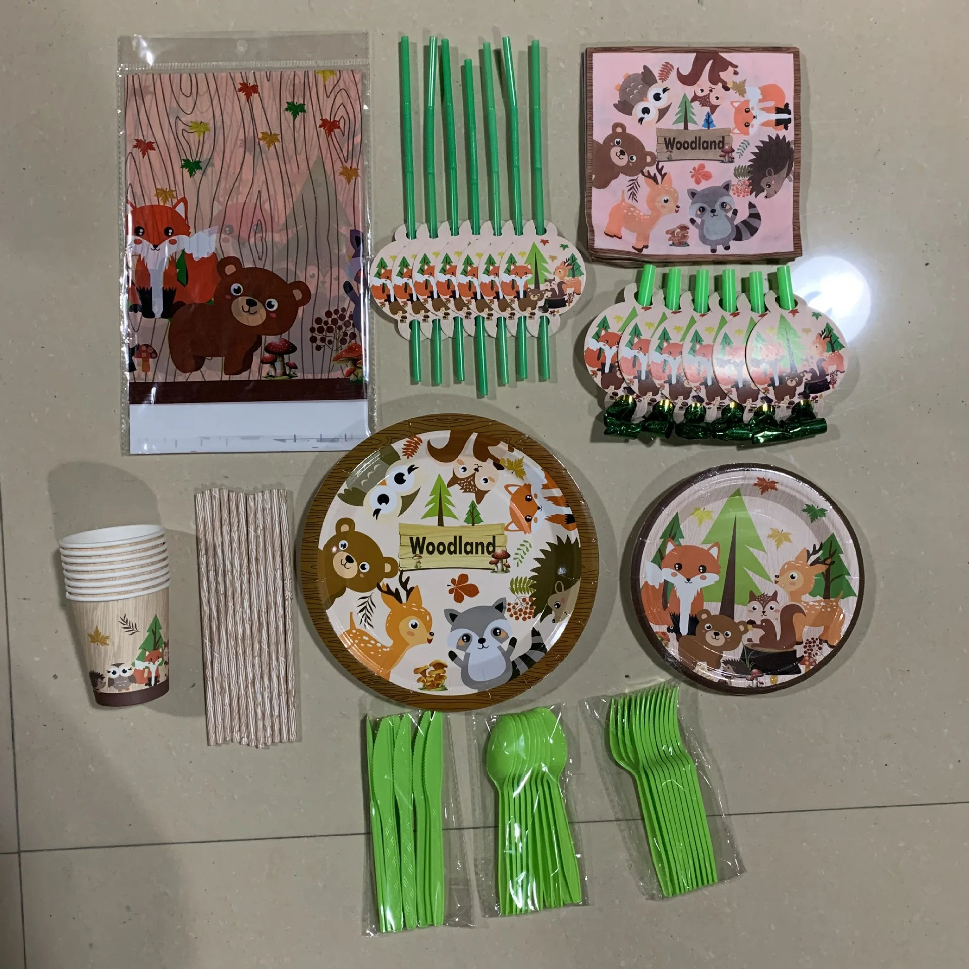 Тематические лесные животные, украшения для детского дня рождения, Подарочная сумка, искусственная коробка, ложка, детский душ, одноразовая посуда, принадлежности