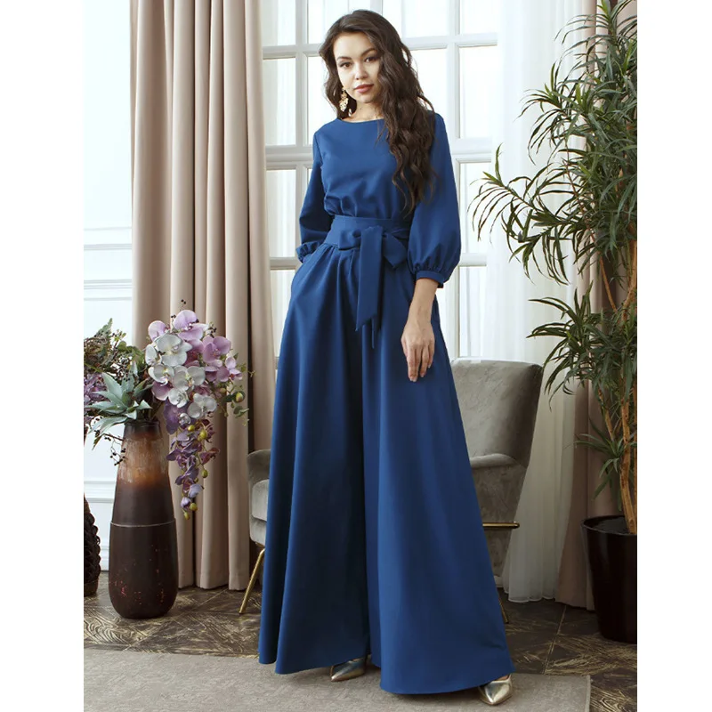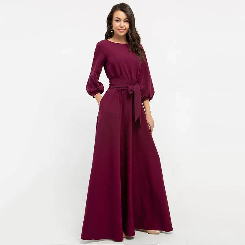 Женское платье до пола, однотонное зеленое платье макси с бантом и рукавами-фонариками