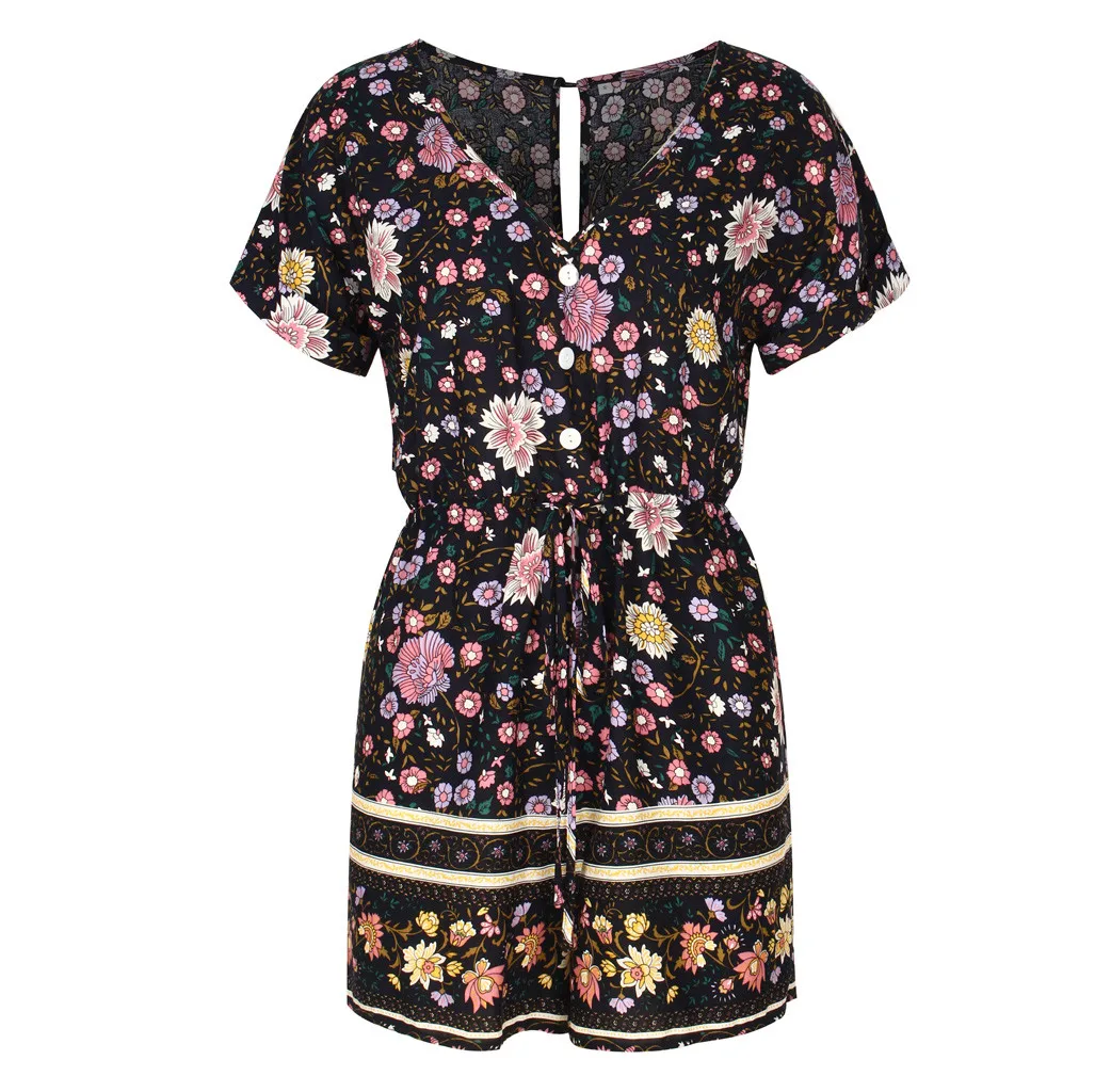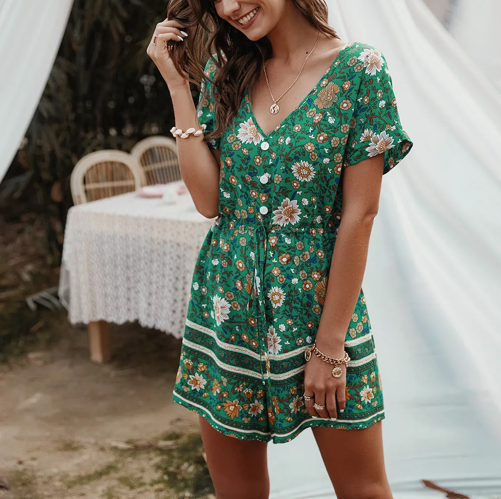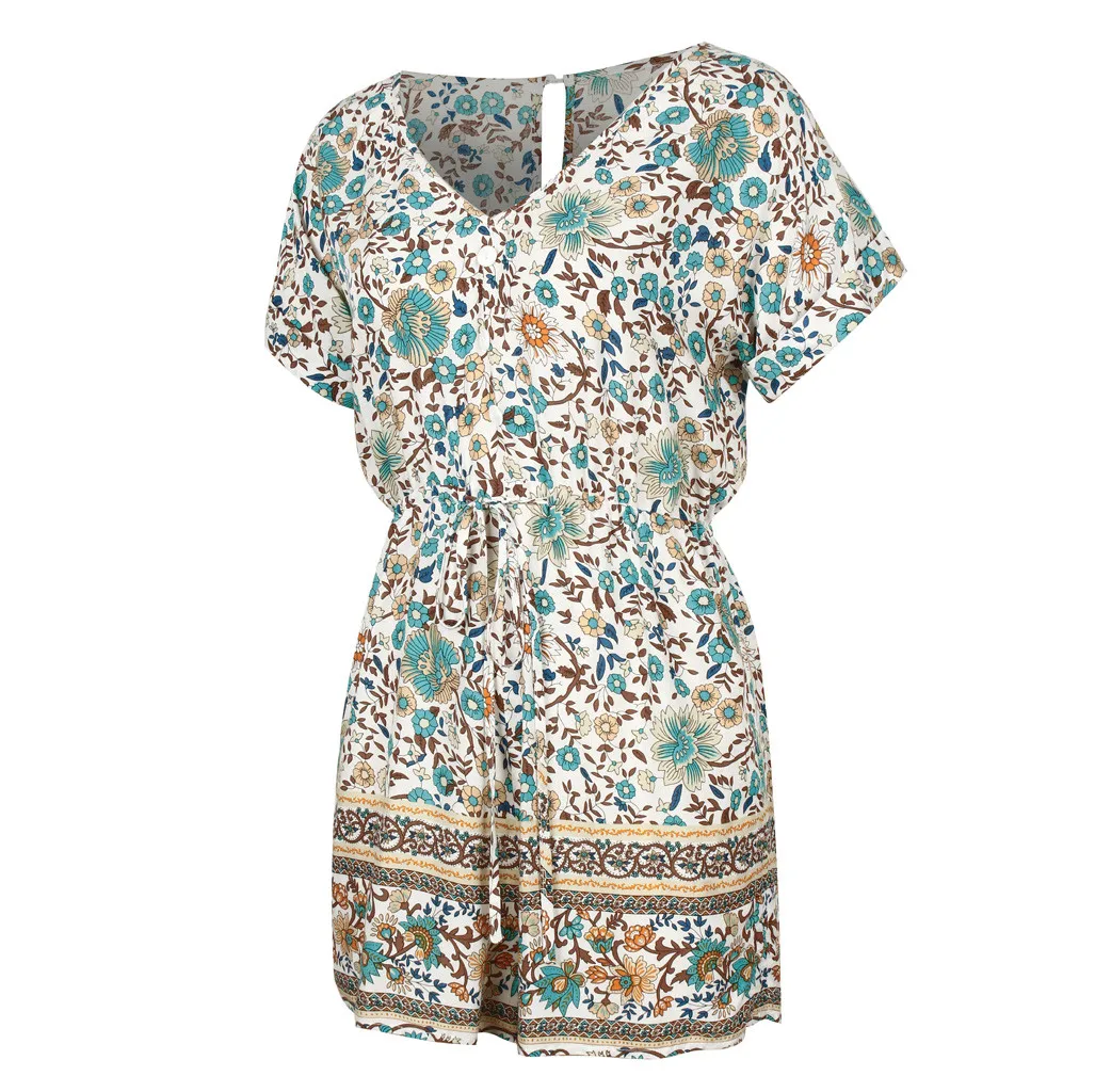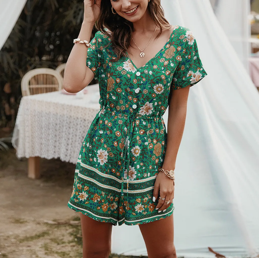 Модные женские летние богемные боди с v-образным вырезом, повседневные пляжные вечерние комбинезоны с коротким рукавом и цветочным принтом, короткий комбинезон # p3