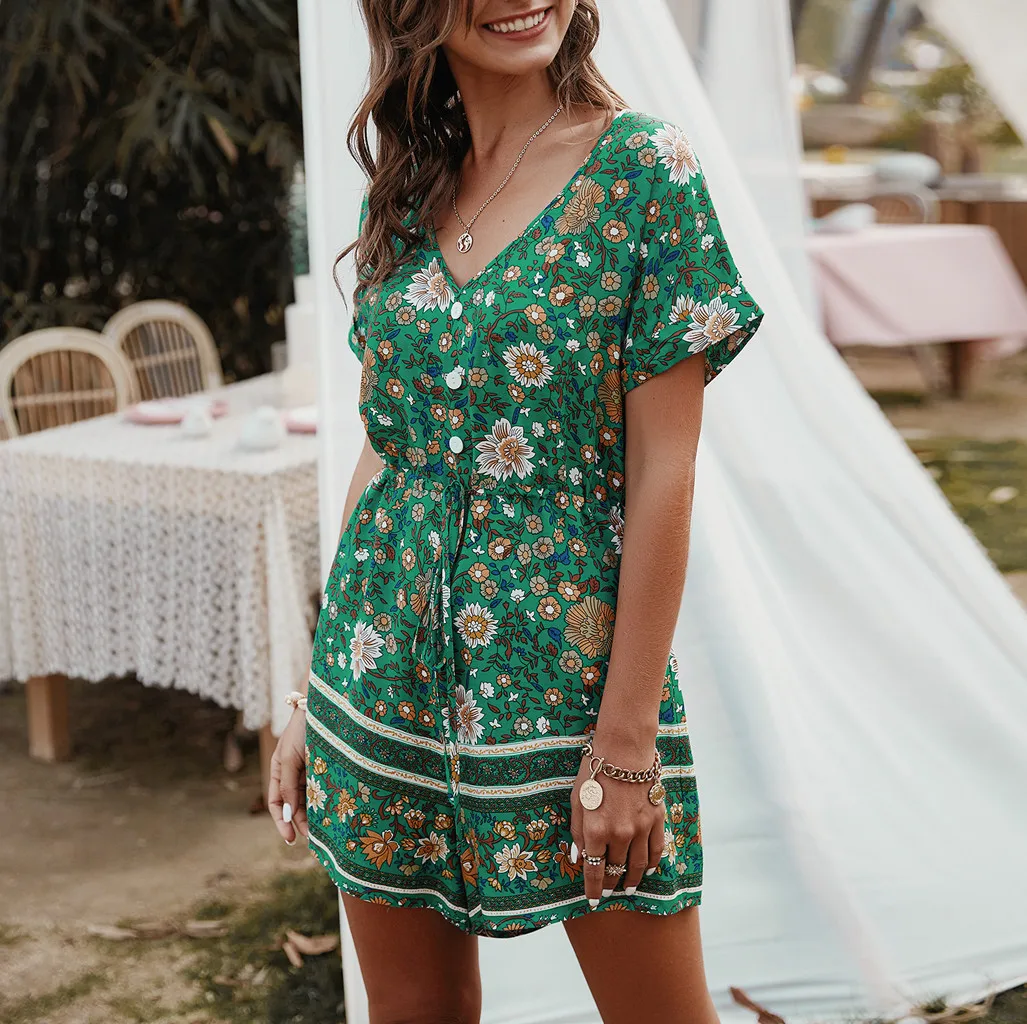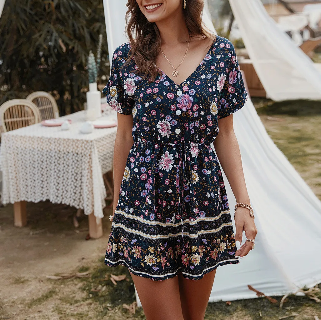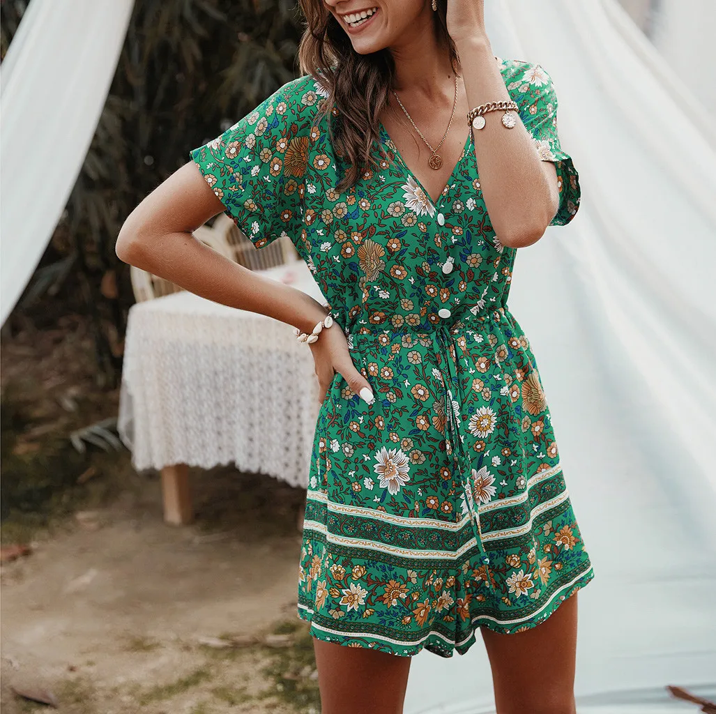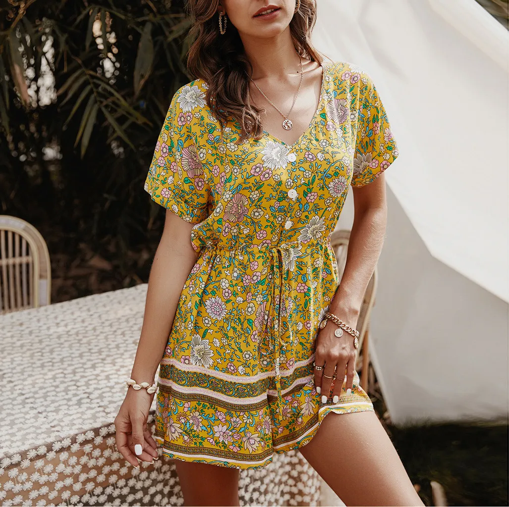 Модные женские летние богемные боди с v-образным вырезом, повседневные пляжные вечерние комбинезоны с коротким рукавом и цветочным принтом, короткий комбинезон # p3