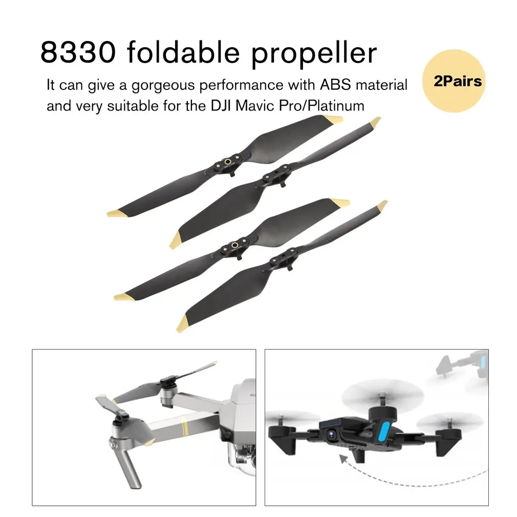 Особенности:Низкий уровень шума: он может сделать общий уровень шума 4 дБ.Материал ПК: он может дать вам отличный опыт с этим высоким качеством.Новый дизайн, отличная производительность шумоподавления, более длительное время полета.Совместим с платиновым дроном DJI Mavic Pro.