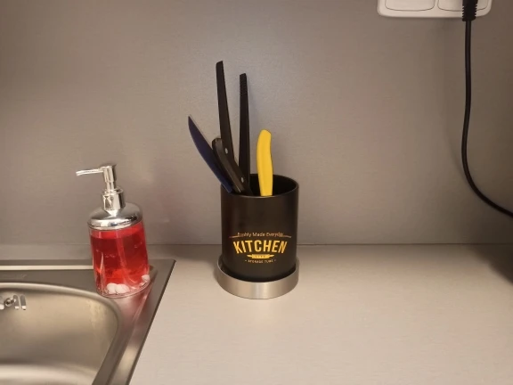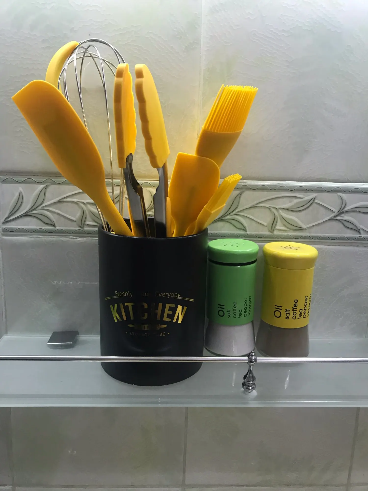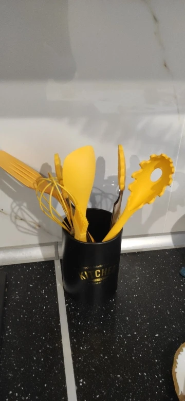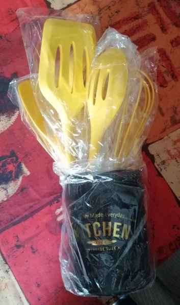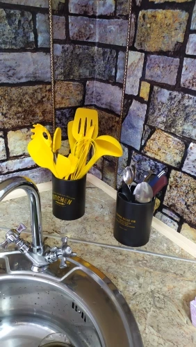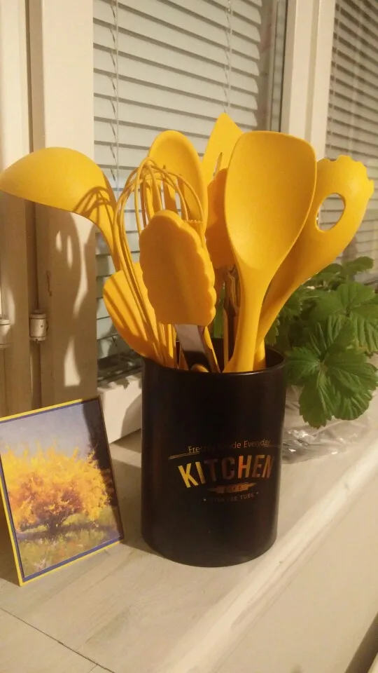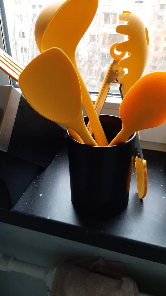 Набор приборов понравился. Силикон плотный, без запаха, имеет металлический каркас внутри. Красивый, солнечный цвет - поднимает настроение)) Брала набор с металлической подставкой, снизу есть дырочки для сушки - удобно. Она вместительная и устойчивая.