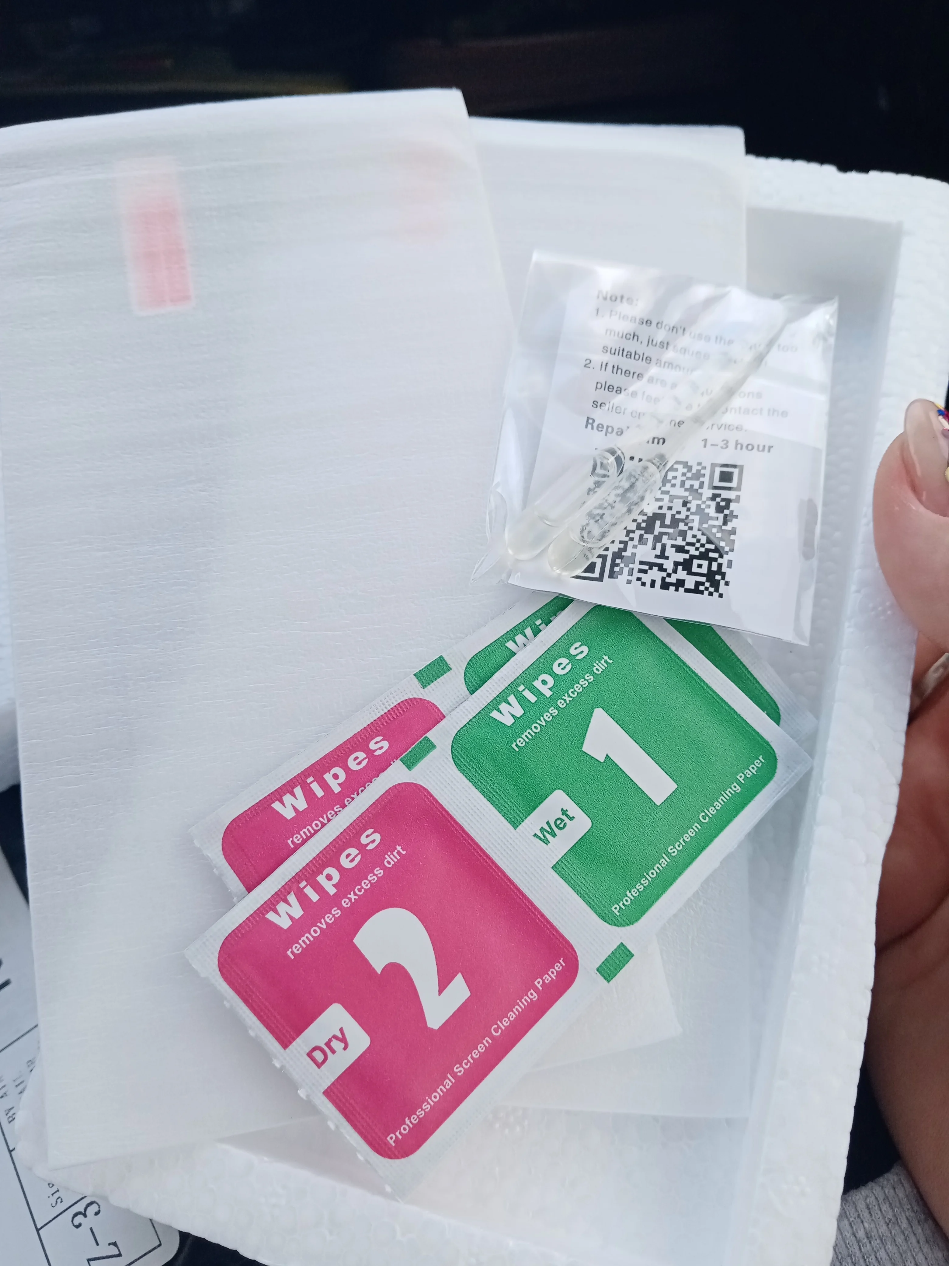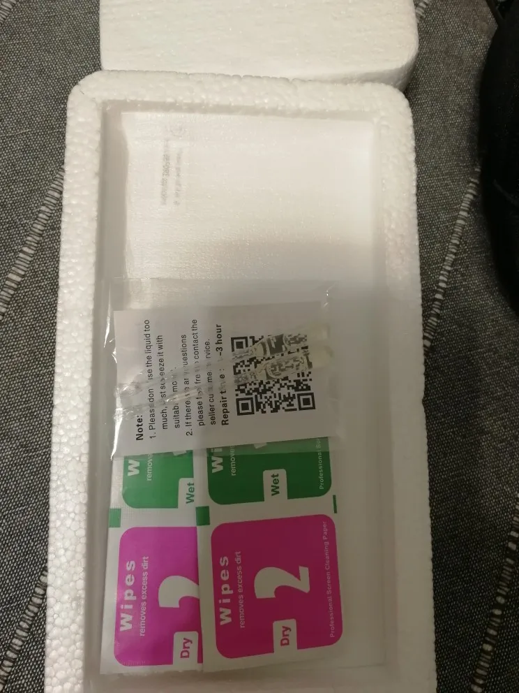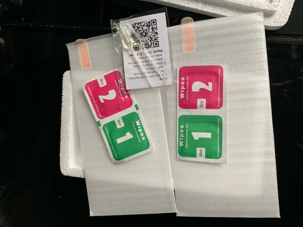 К стеклам прилагались салфетки для чистки и очень полезная жижа для заполнения пустот по краям стекла. Всего по 2 комплекта. Упакованы надежно в пенопластовый футляр. Очень быстрая доставка. Стекла доехали за 2 недели
