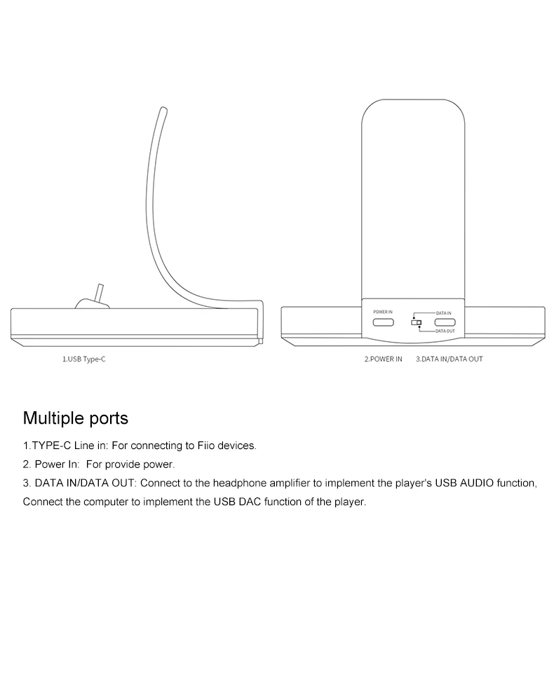 1.TYPE-C линия: для подключения к устройствам Fiio. 2. Питание: для обеспечения мощности. 3. Вход/выход данных: подключение к усилителю наушников для реализации функции USB аудио проигрывателя, Подключение компьютера для реализации функции USB DAC проигрывателя.