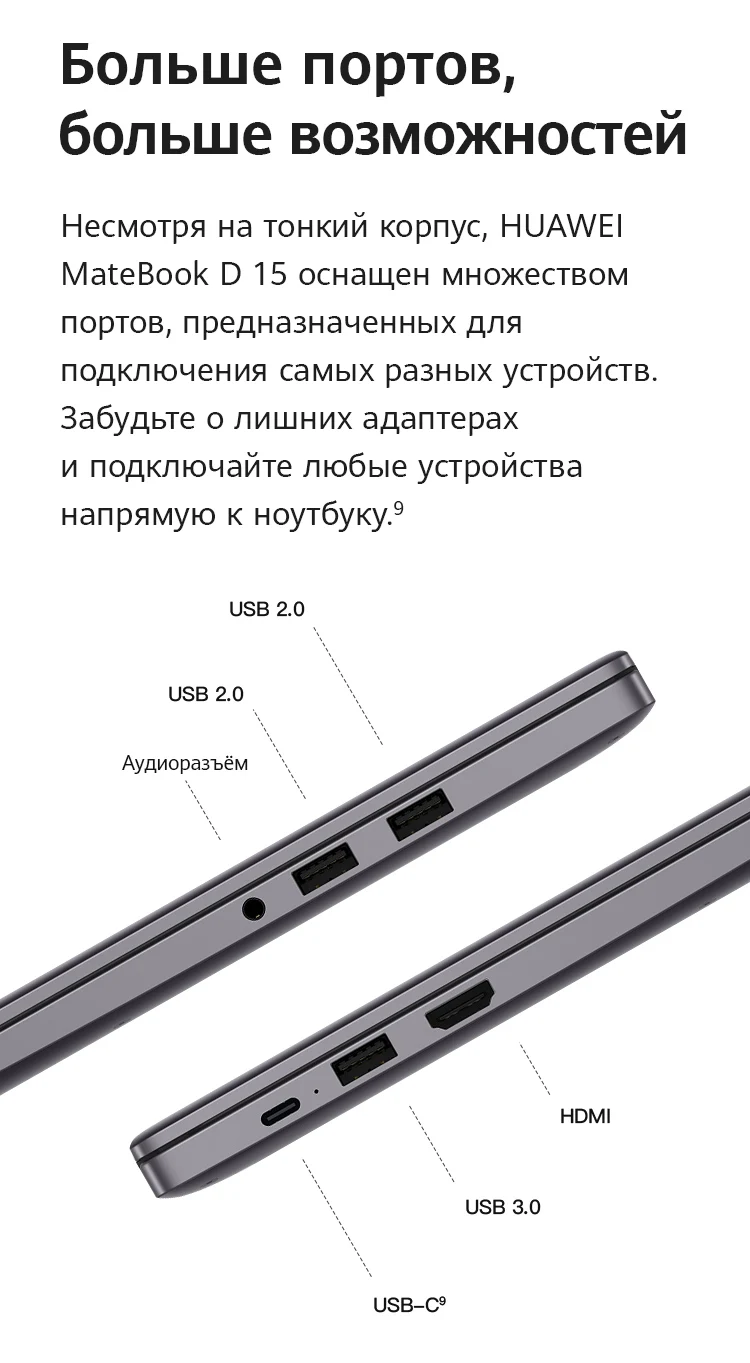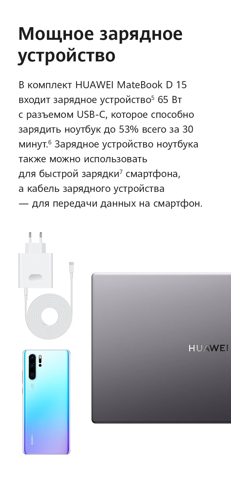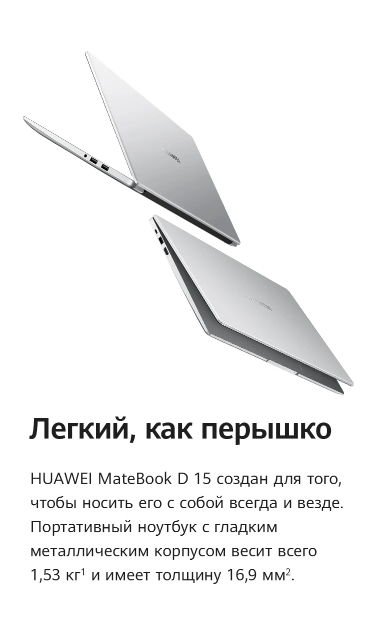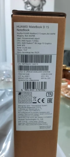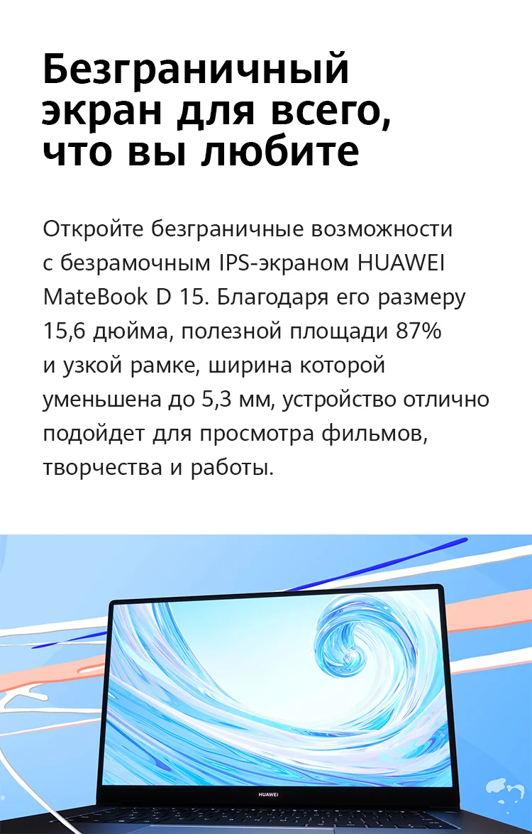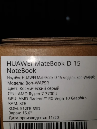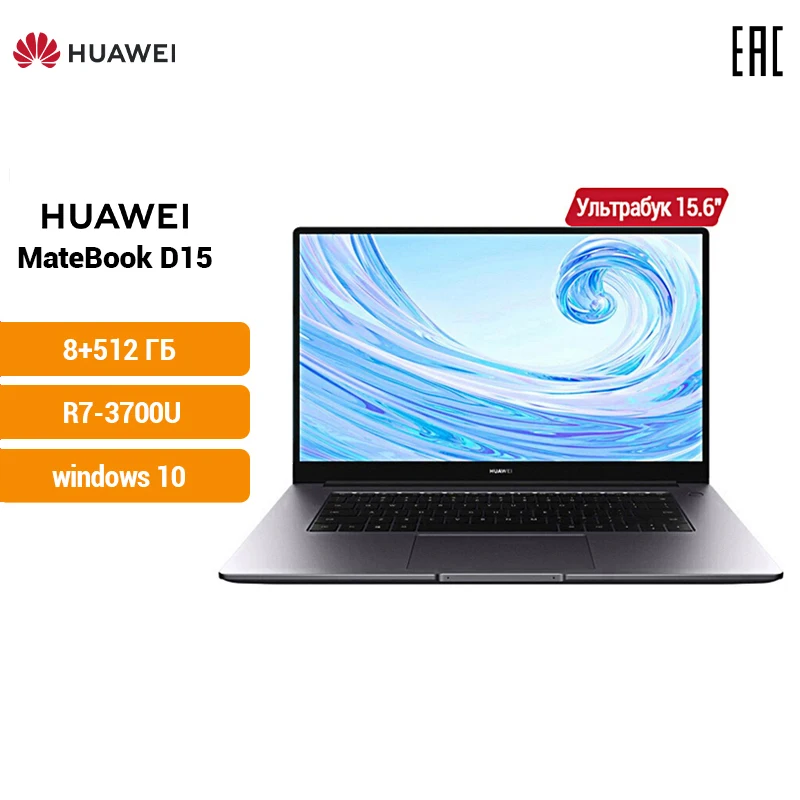 Ноутбук HUAWEI MateBook D 1515.6,8Гб+512Гб AMD R7 3700U,IPS ,AMD Radeon RX Vega 10, win10ультрабук,российская гарантиясерый