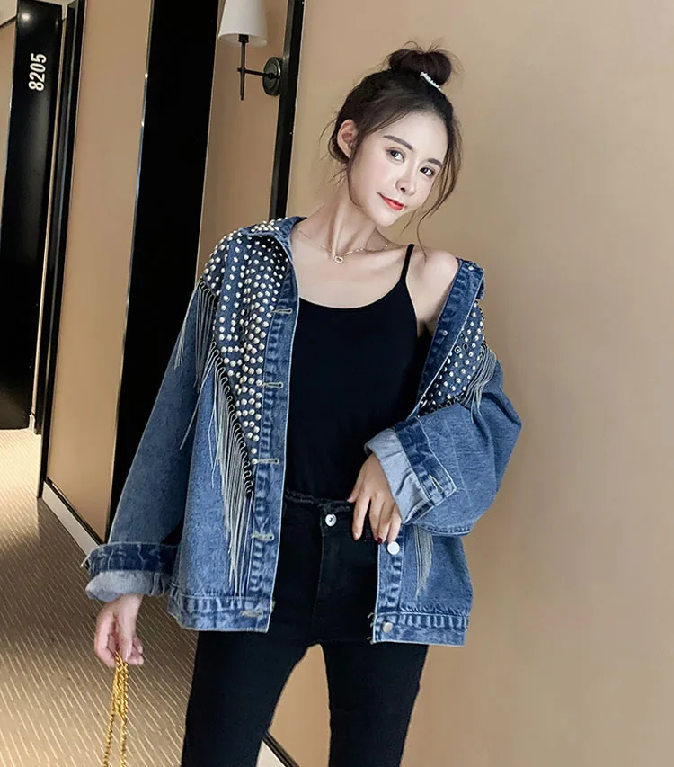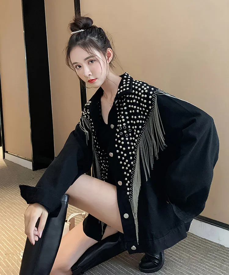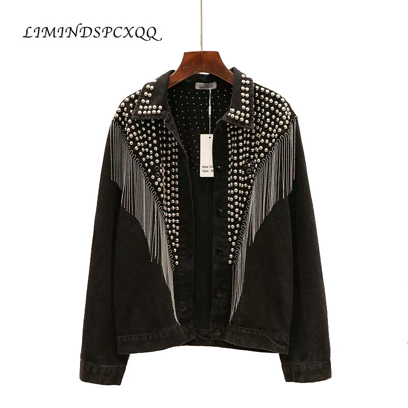 Женская джинсовая куртка с длинным рукавом, Осеннее короткое пальто с заклепками и бахромой на цепочке, свободная уличная одежда черного цвета