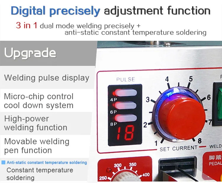 Сварные части Вход напряжение: AC220V / 110V + 20V Мощность: 1,5 кВт (мгновенная Сварочный ток: 500A 2 импульсных времени: 1-10 мс (переменная) 4 импульсных времени: 2-20 мс (переменная 8 импульсов: 8-80 мс (переменная) Толщина сварки фиксированная Сварка: 0,05 ~ 0,35 мм Сварочная ручка Толщина сварки: 0,05 ~ 0,2 мм Сварные части Температура: 150 ° C ~ 450 ° C Постоянная температура: ± 5 °C Выход напряжение: 20VDC Мощность: 50 Вт Время нагрева: от 6 до 8 с до 300 градусов Цельсия