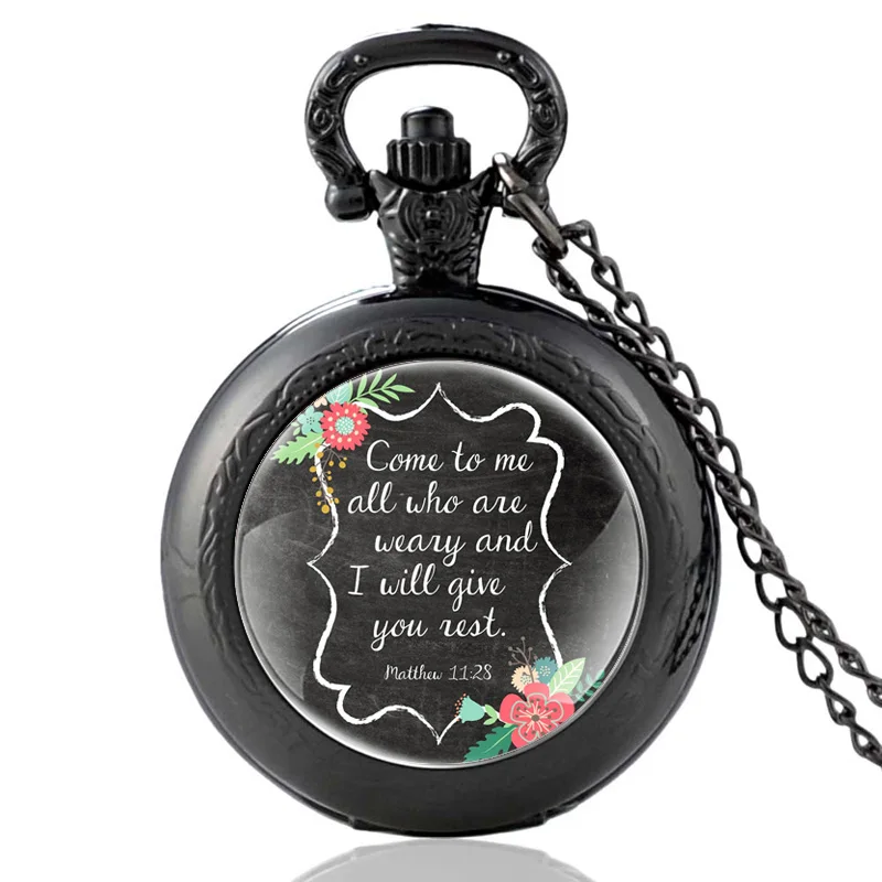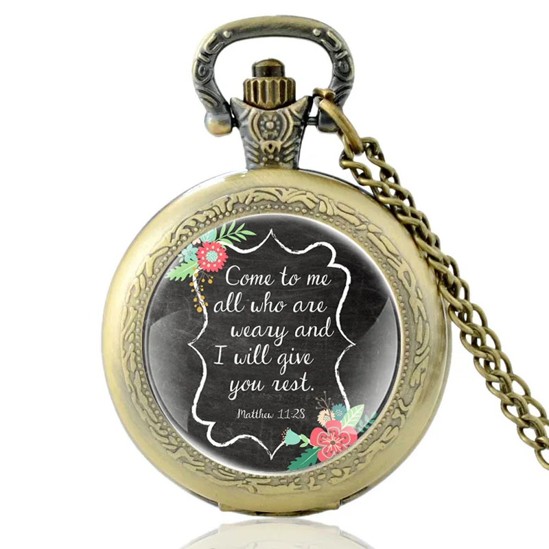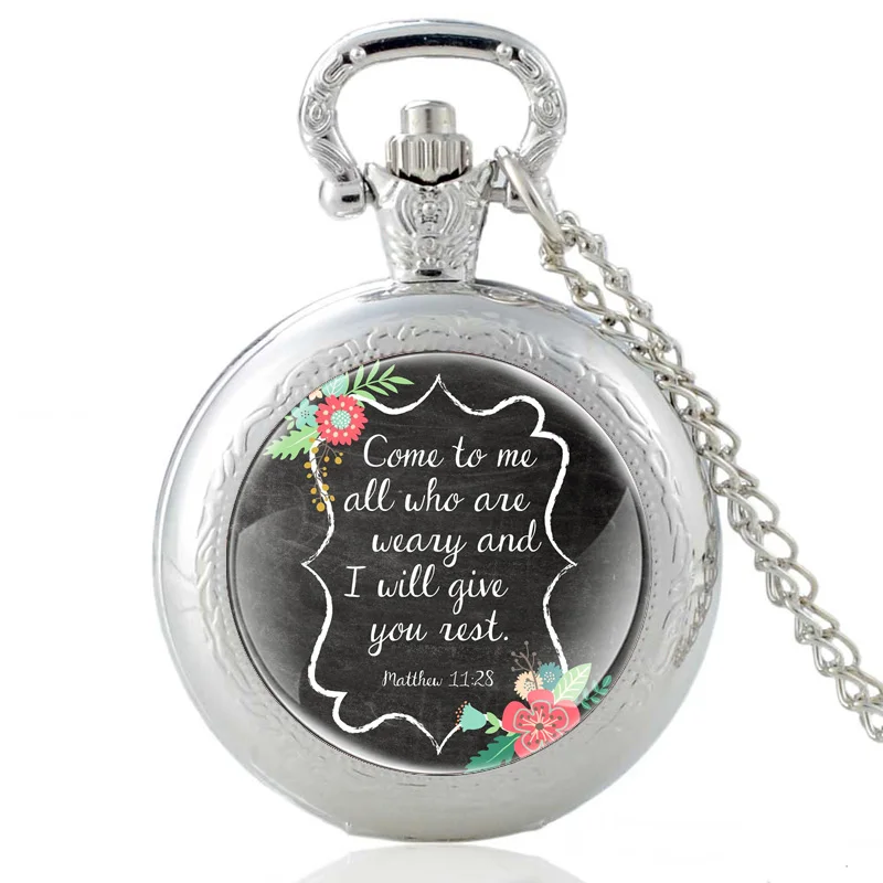 Библейский стих "приходите ко мне все, кто утомлен и я дам вам, чтобы не" кварцевые карманные часы для мужчин и женщин кулон ожерелье часы