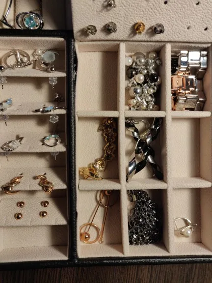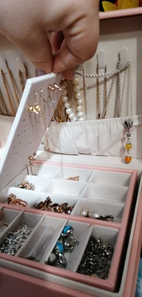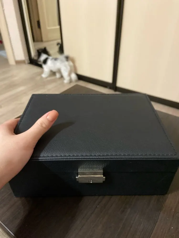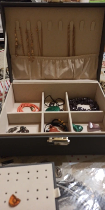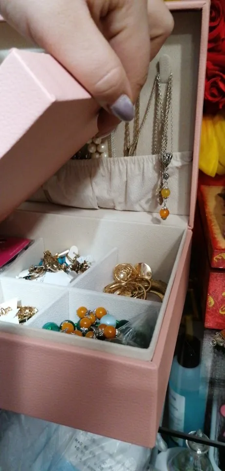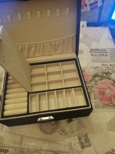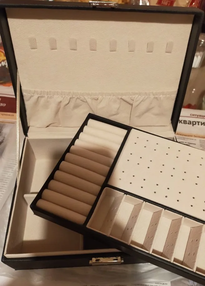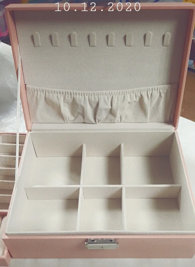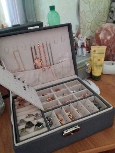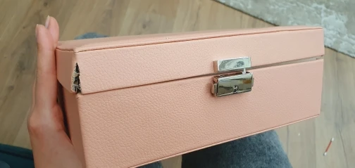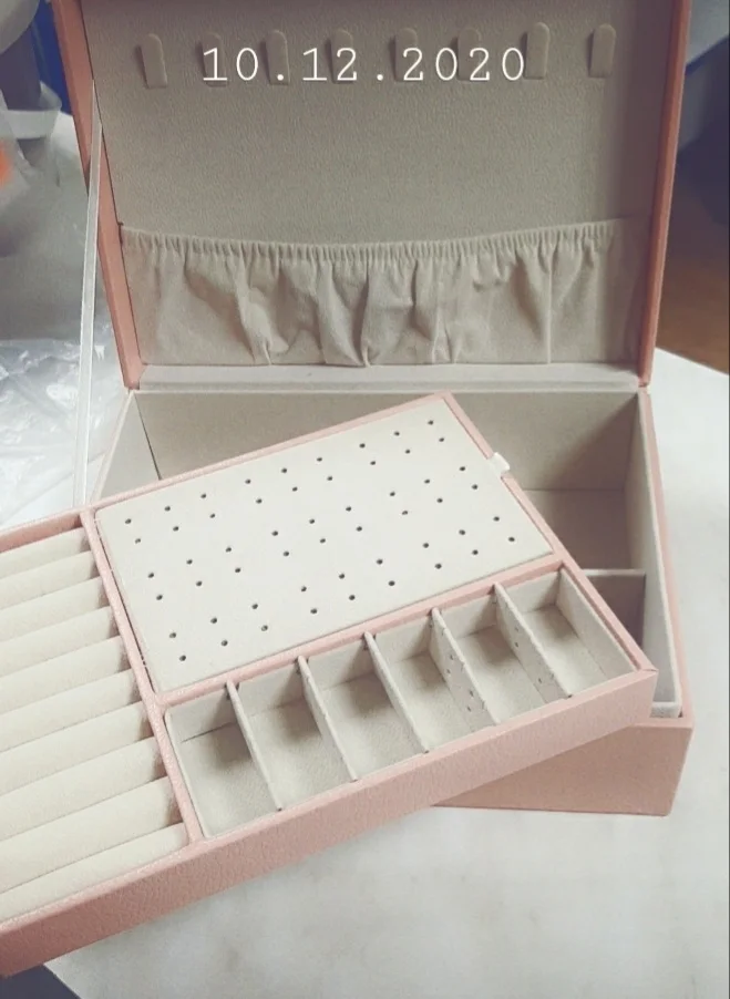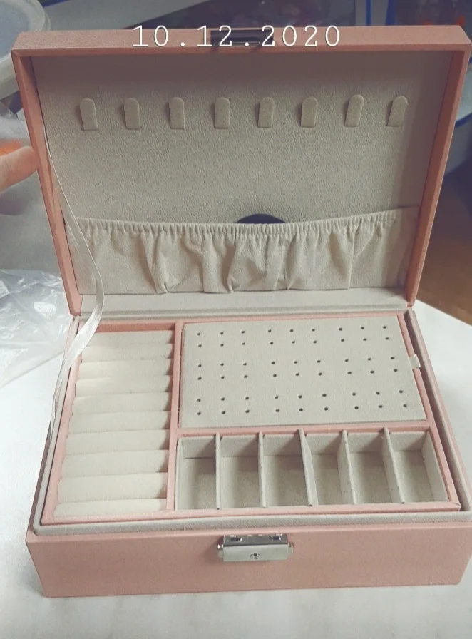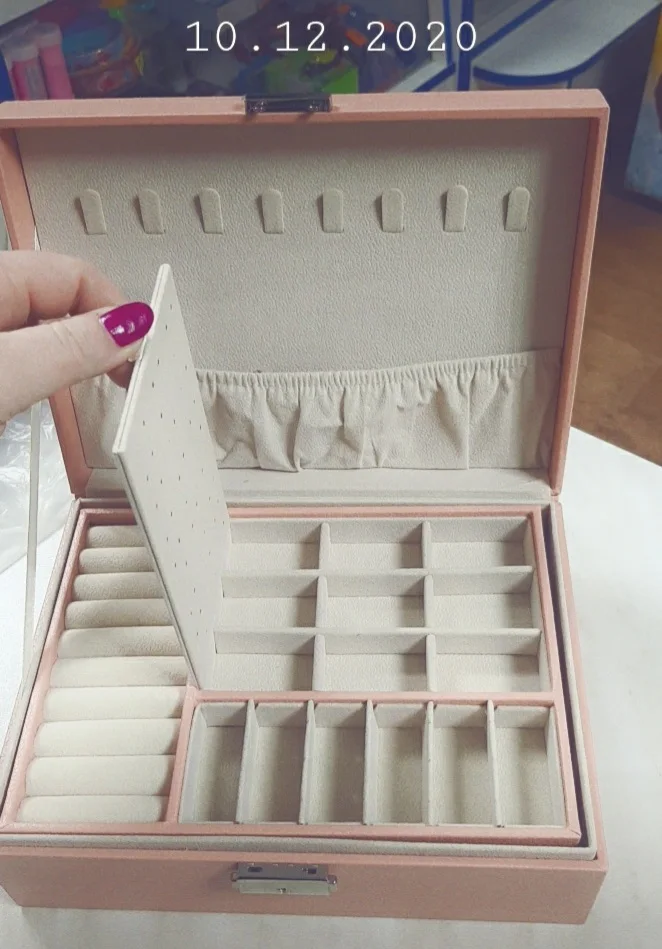 шкатулочка крутая. Очень вместительная. При помощи её освободила 3 шкатулки поменьше. Её огромный плюс- это что у каждого украшения своё место. Но есть и минус- её целостность была нарушена. По-видимому её чем-то придавили во время доставки. Не удивительно! Много видео в интернете как расфосовывают почту.... От этого разошёлся угол и замочек поломался(как видно на фото). Это меня немного расстроило, но сама шкатулка просто шик! Имеется не сильный запах.