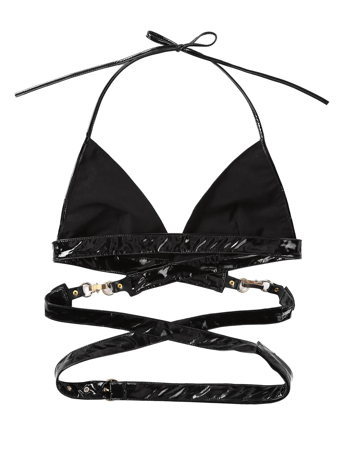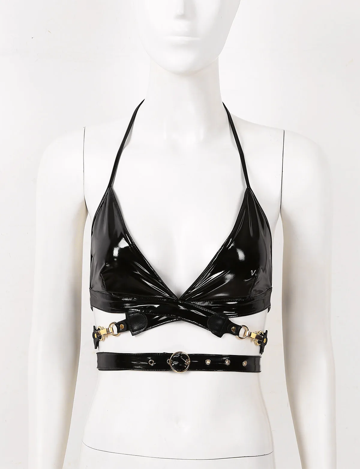 Женская латексная майка для танцев на шесте, женское кожаное нижнее белье с открытой спиной, бюстгальтер с пряжкой, кроп-топ для клуба