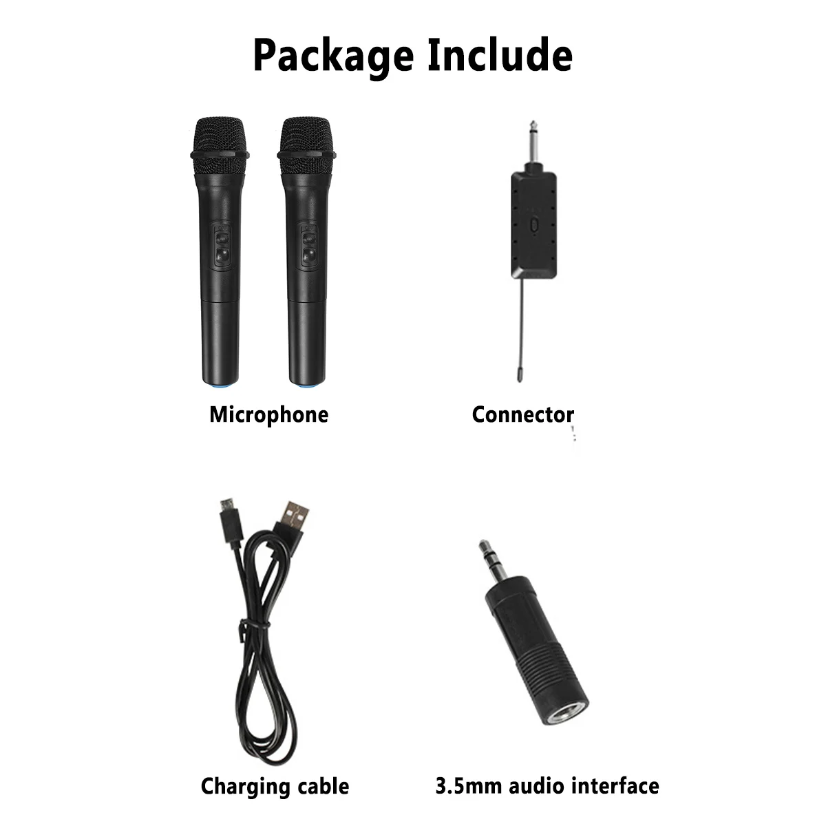 Посылка тация:2 микрофона (батарейка входит в комплект)1*6,5 мм до 3,5 мм аудио интерфейс1 * приемник1 * зарядный кабель
