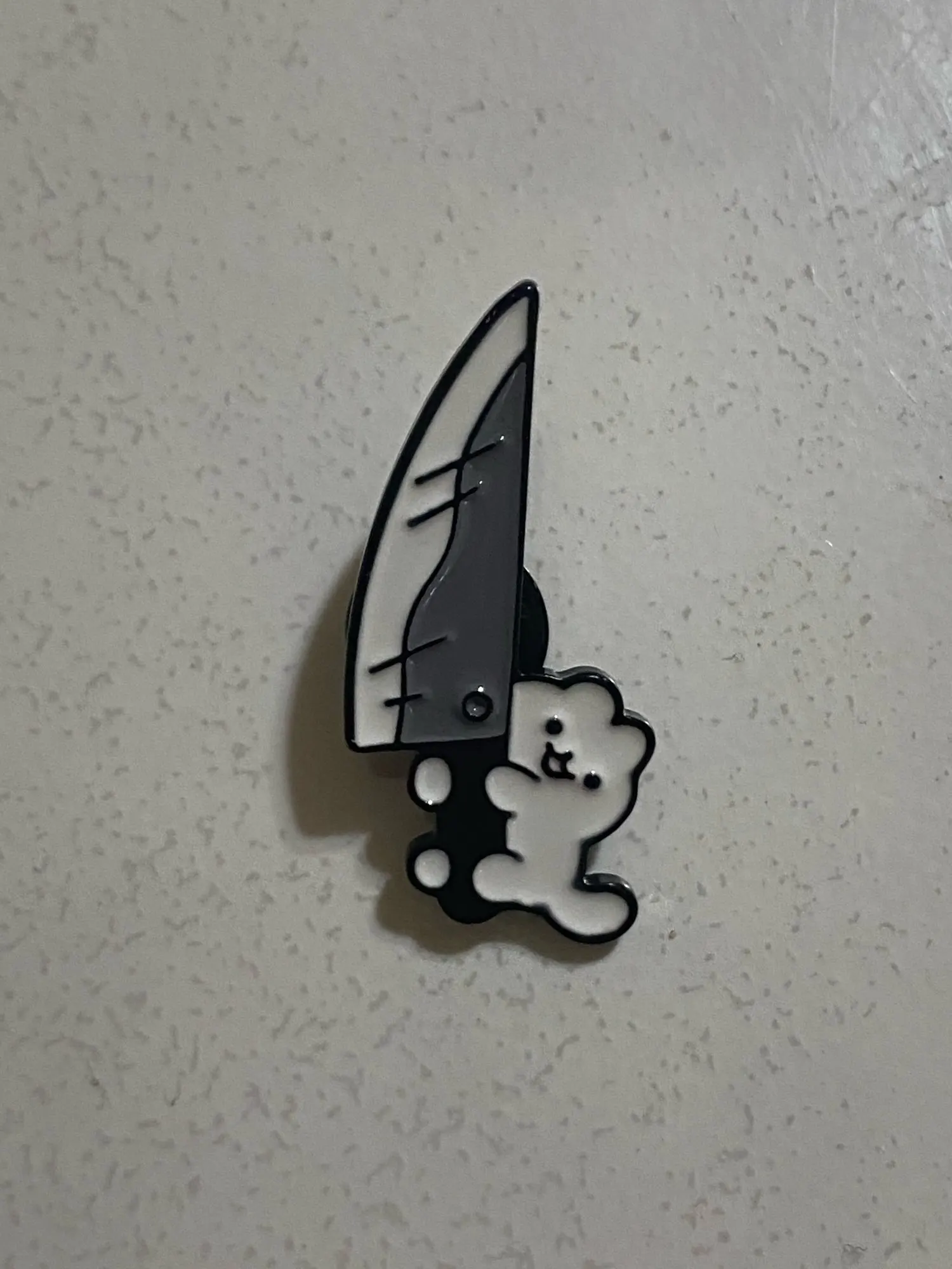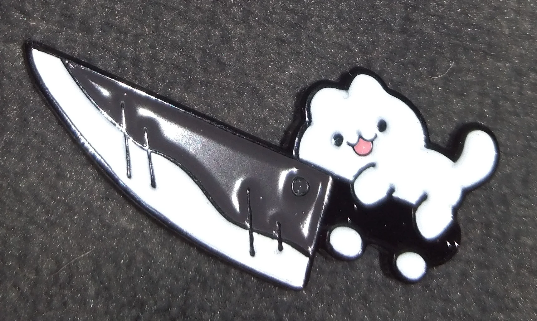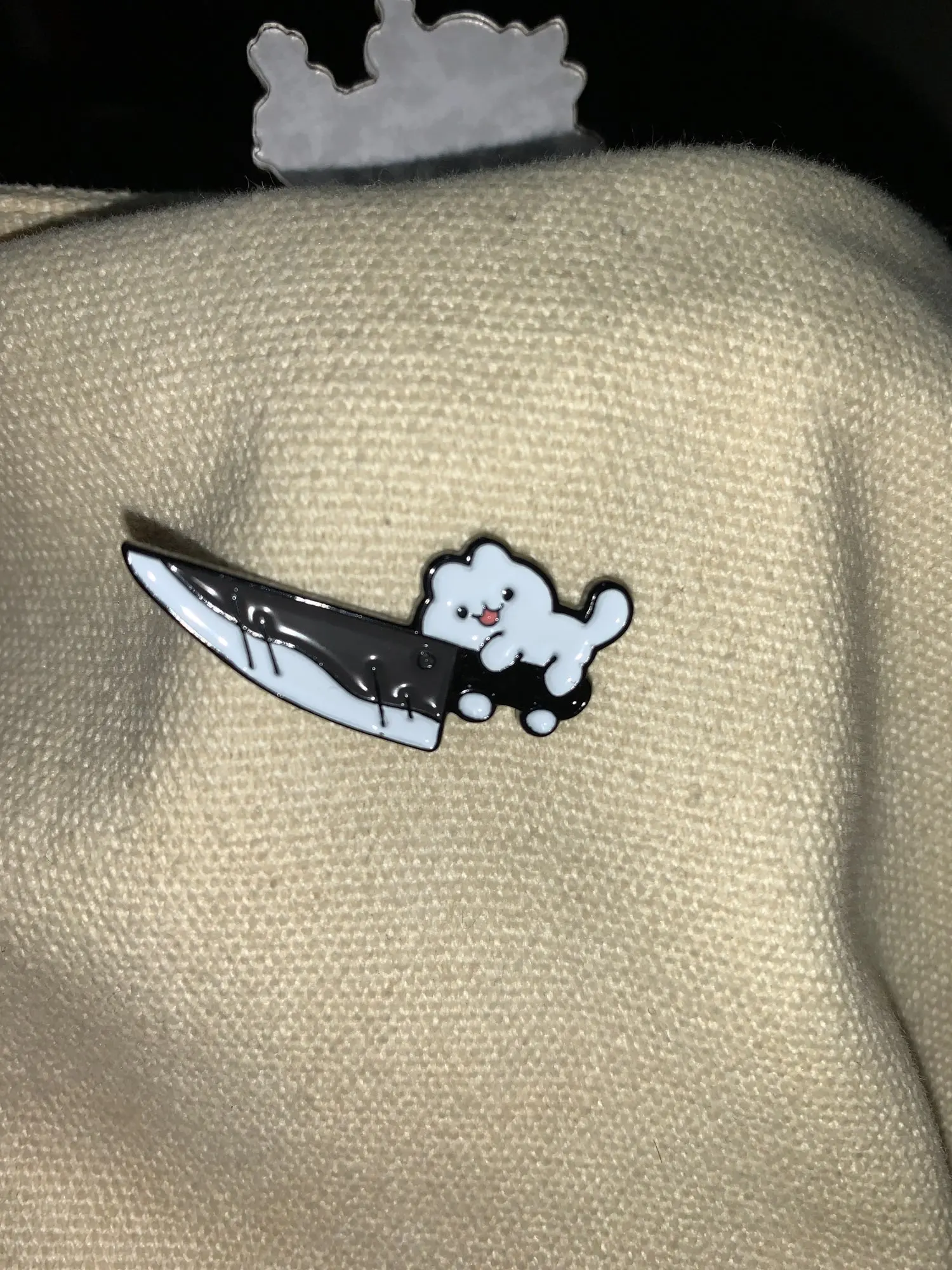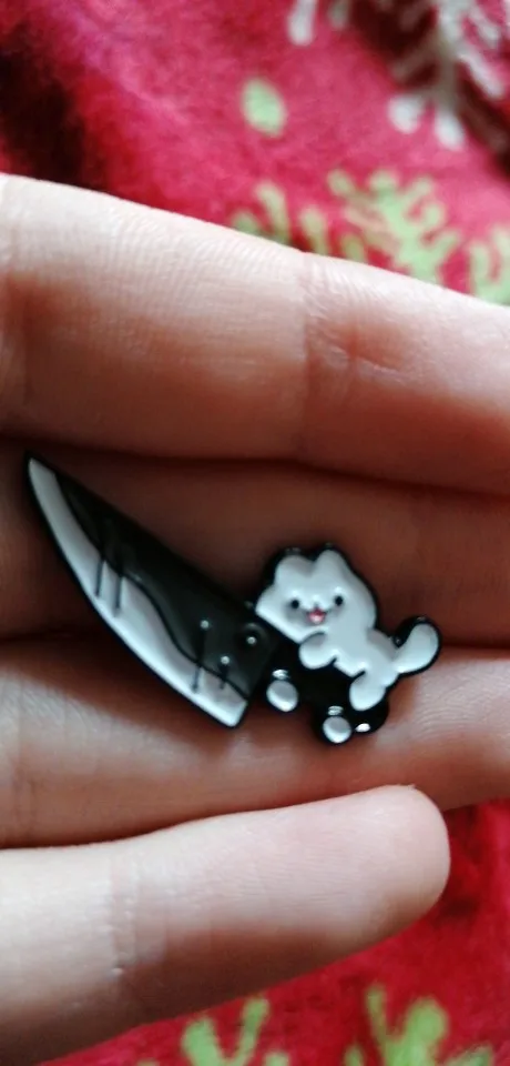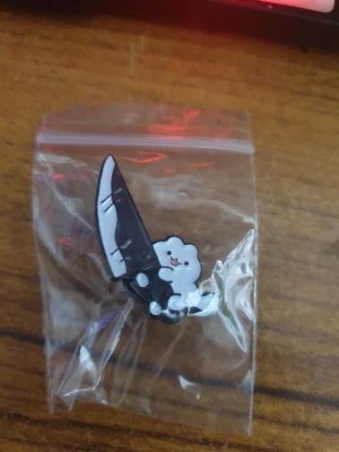 Отличный значок, полное соответствие описанию. у него одно точка крепления, на коте, поэтому нож может цеплятся.