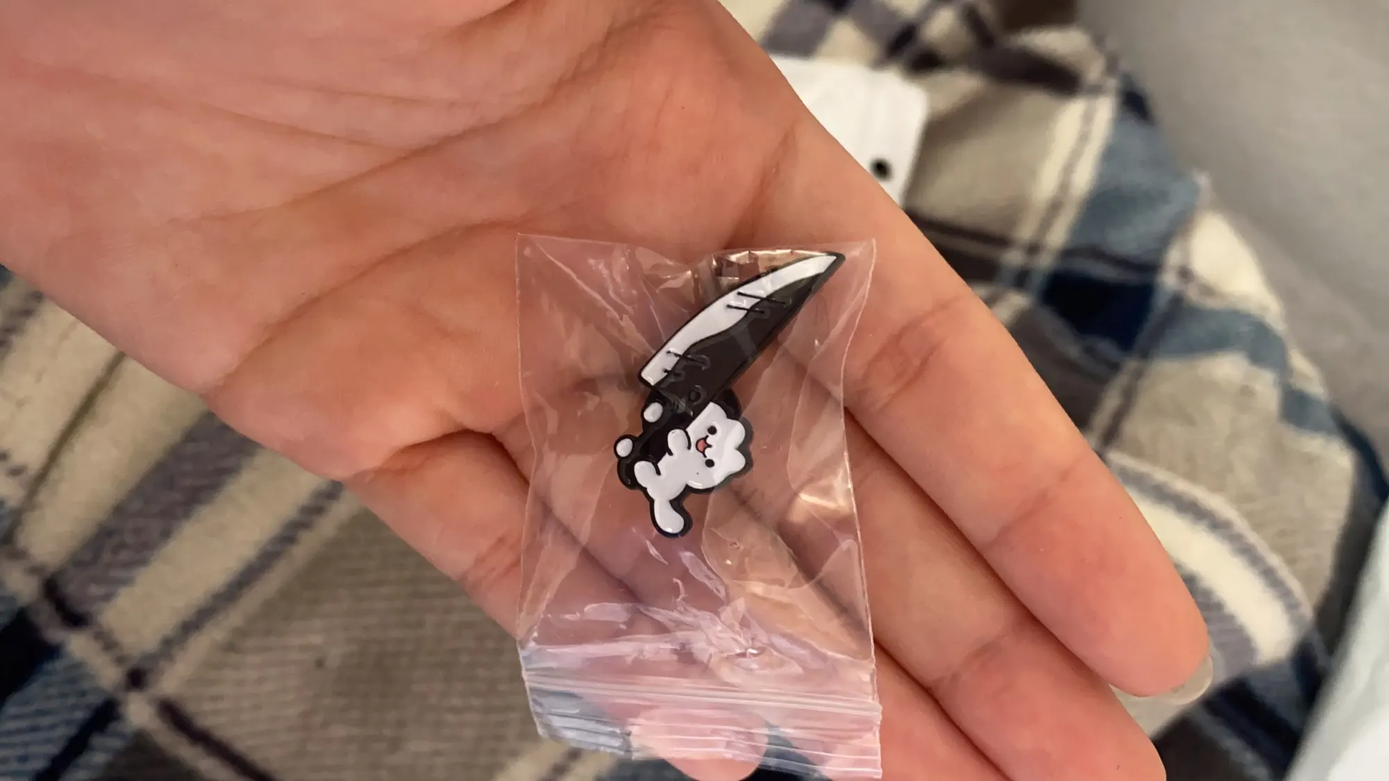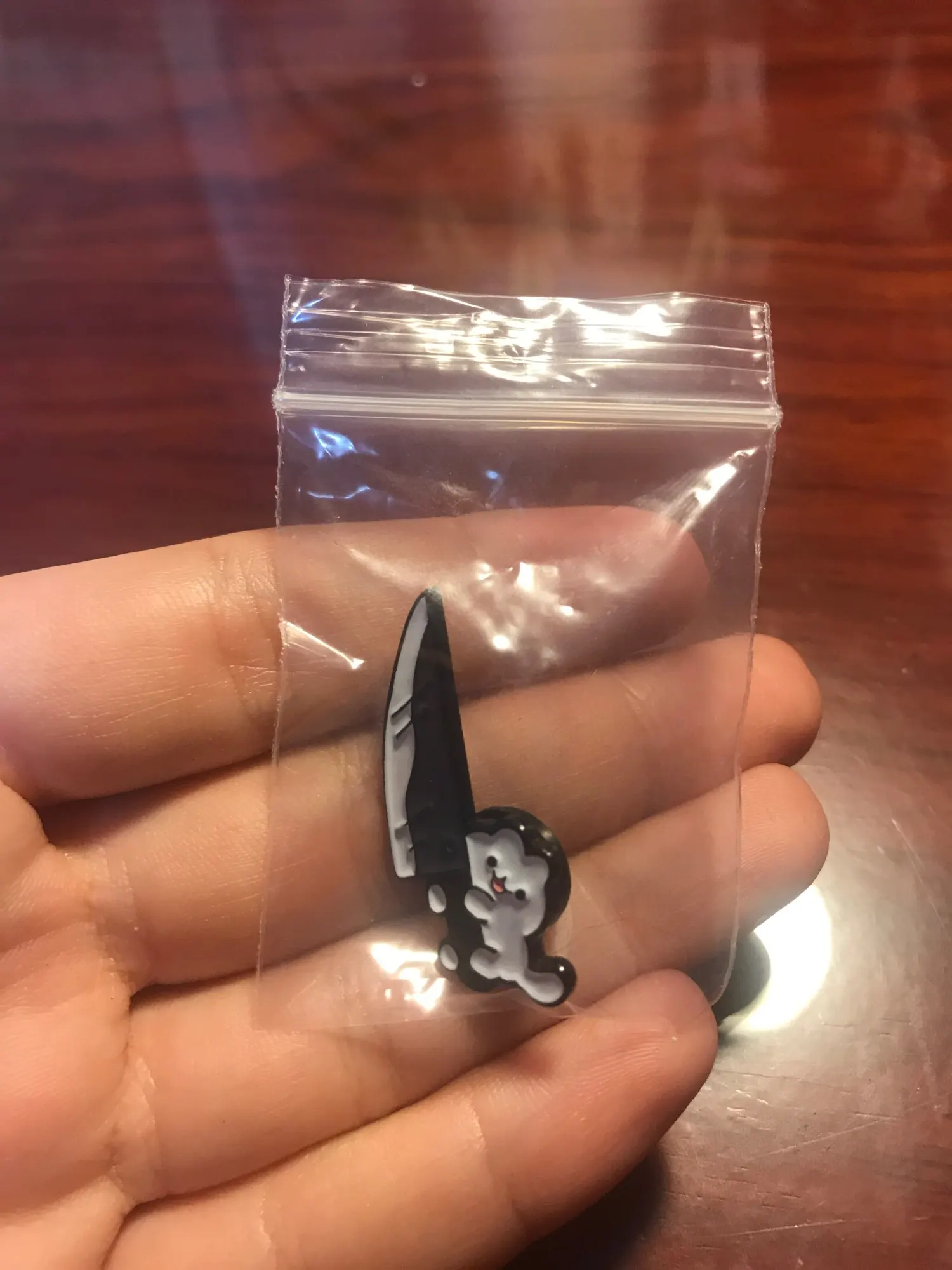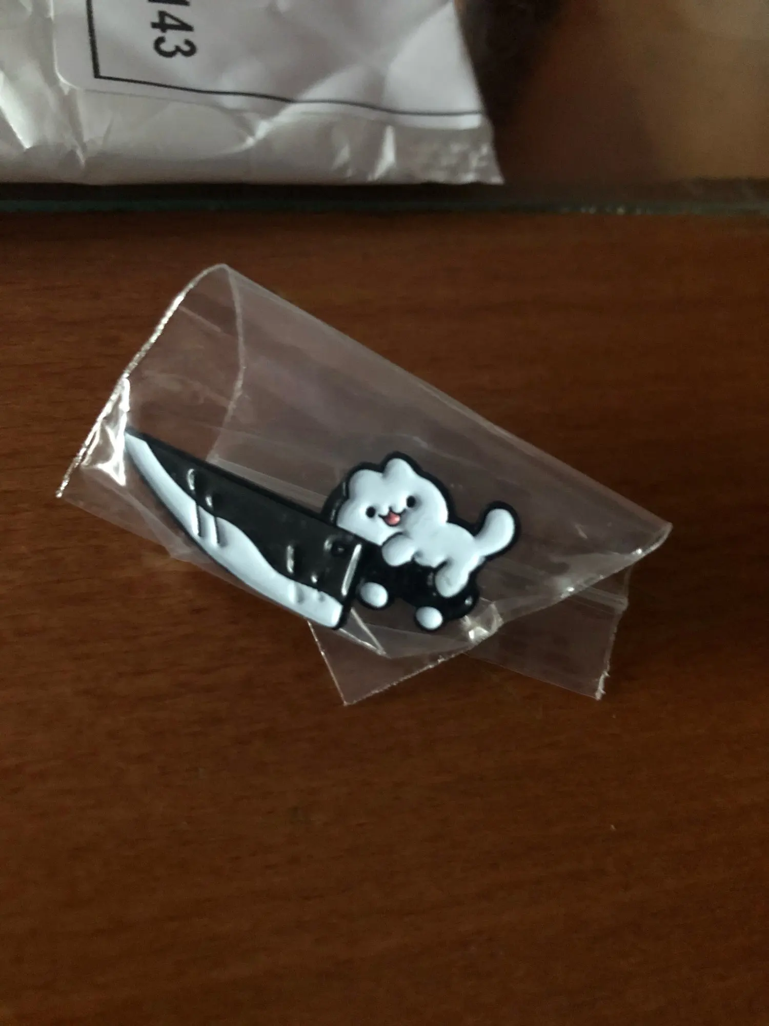 Отличный значок, полное соответствие описанию. у него одно точка крепления, на коте, поэтому нож может цеплятся.