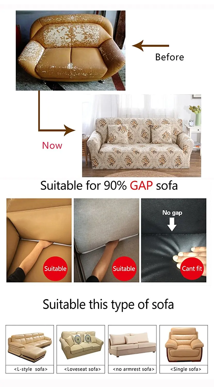 Наш чехол для дивана подходит для дивана, который имеет зазор, между сидением со спинкой и подлокотником. (Пожалуйста, убедитесь, что ваш диван имеет глубокий зазор, чтобы выскользнуть пенопластовые стержни перед покупкой. Наш чехол для дивана не подходит для дивана с мелким зазором.)