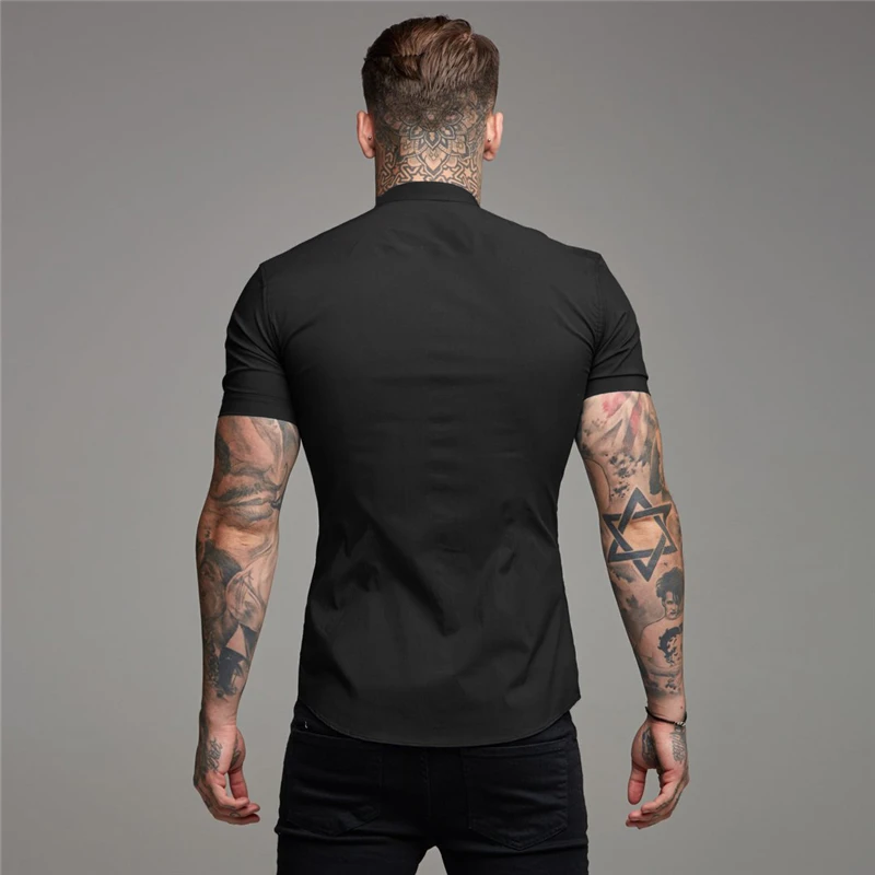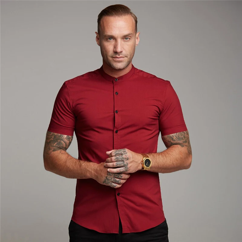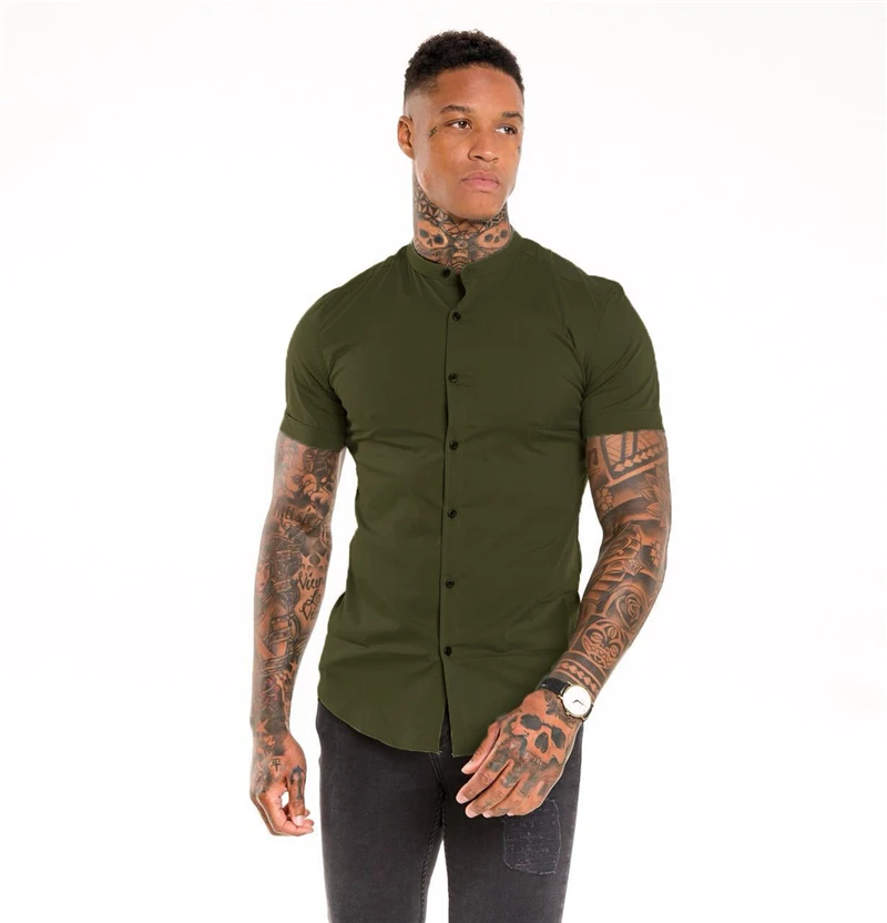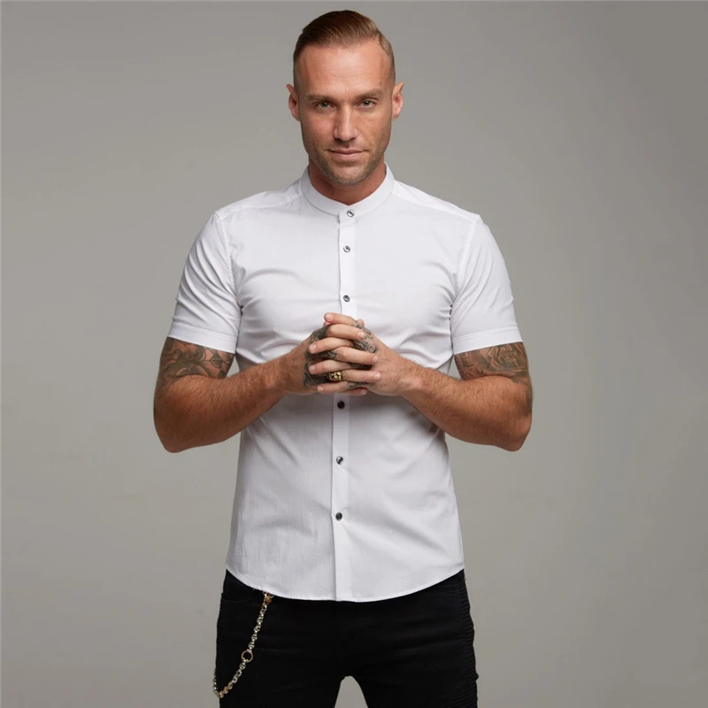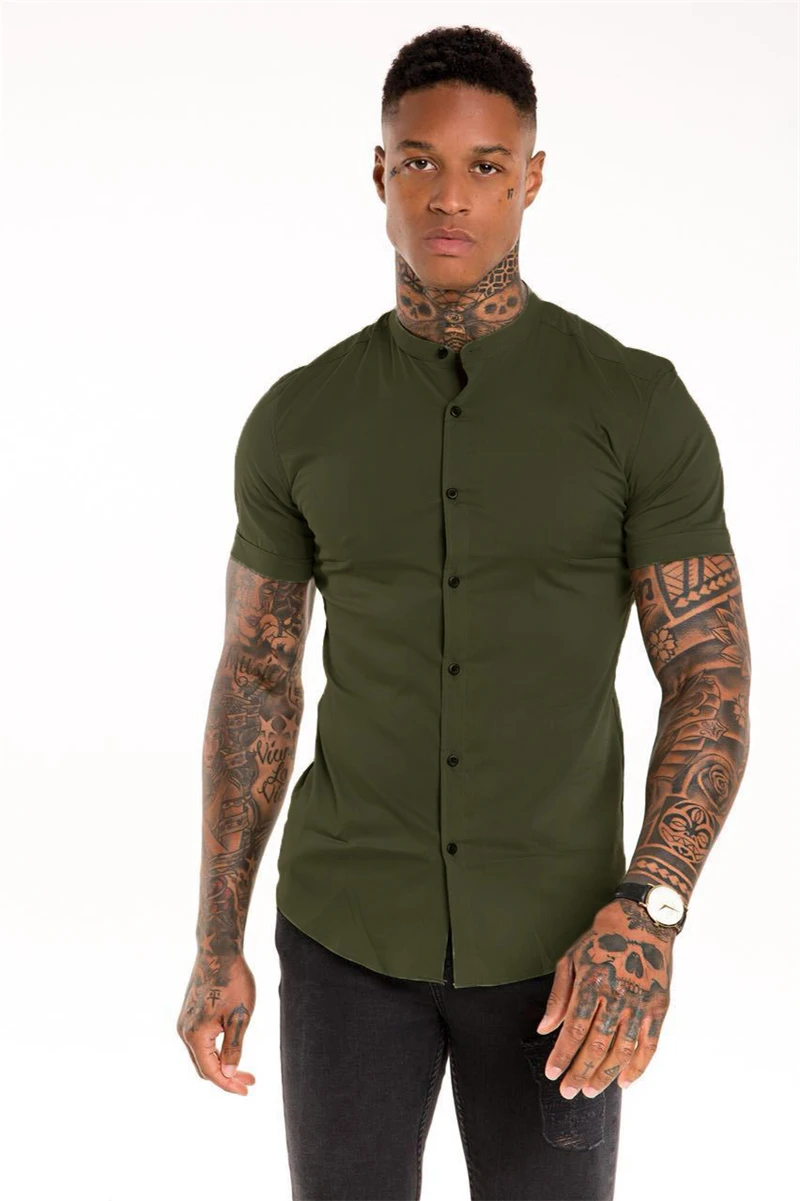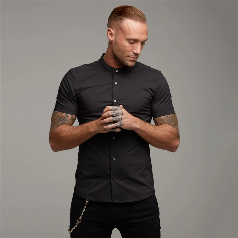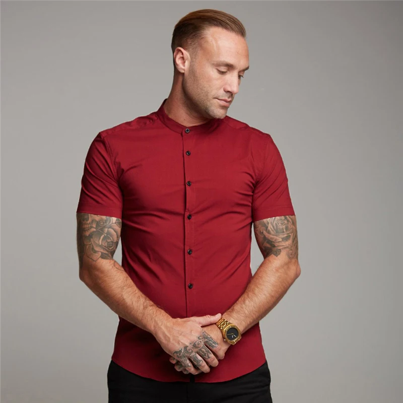 Мужская рубашка, Оригинальная одежда, летняя облегающая Классическая рубашка с коротким рукавом, Мужская однотонная деловая рубашка для фитнеса