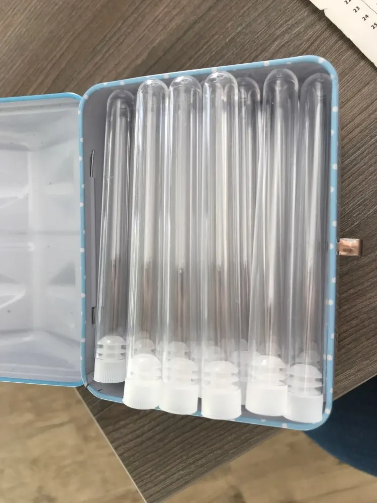 Все в комплекте, 50 труб, 50 крышек Они очень кристаллические. На самом деле, я не хорошо проверял, я хотел, чтобы они держали кисти для ресниц, но у них нет отверстия и они не подходят. Очень жаль. Пришел 3 поврежденных Они прибыли в течение 22 дней