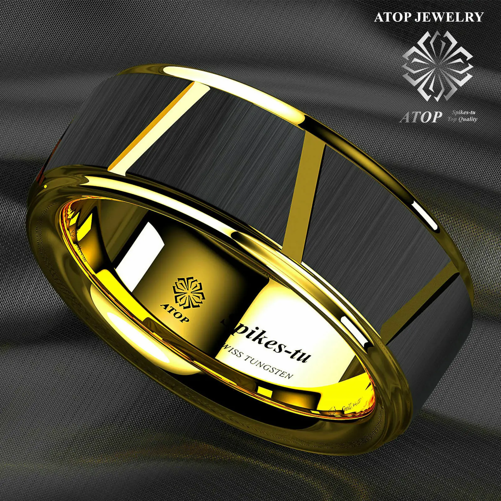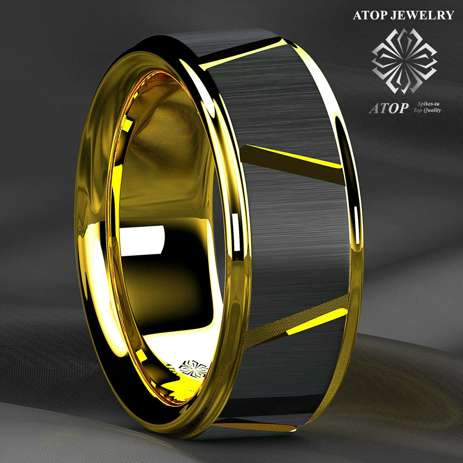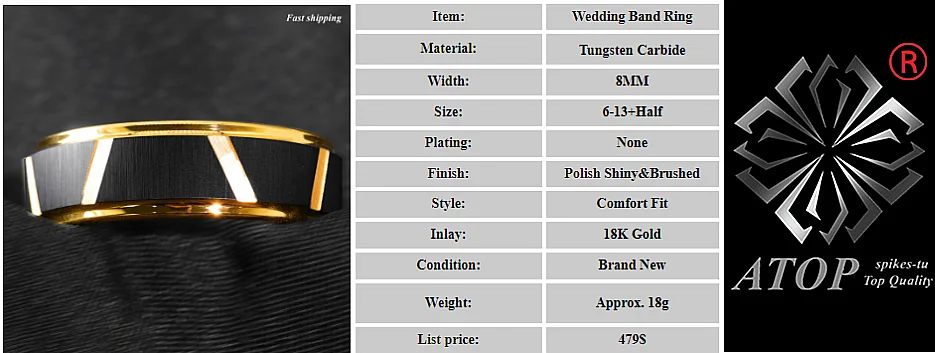 8 черных ромбов полированное сверху вольфрамовое кольцо 18 К золото...