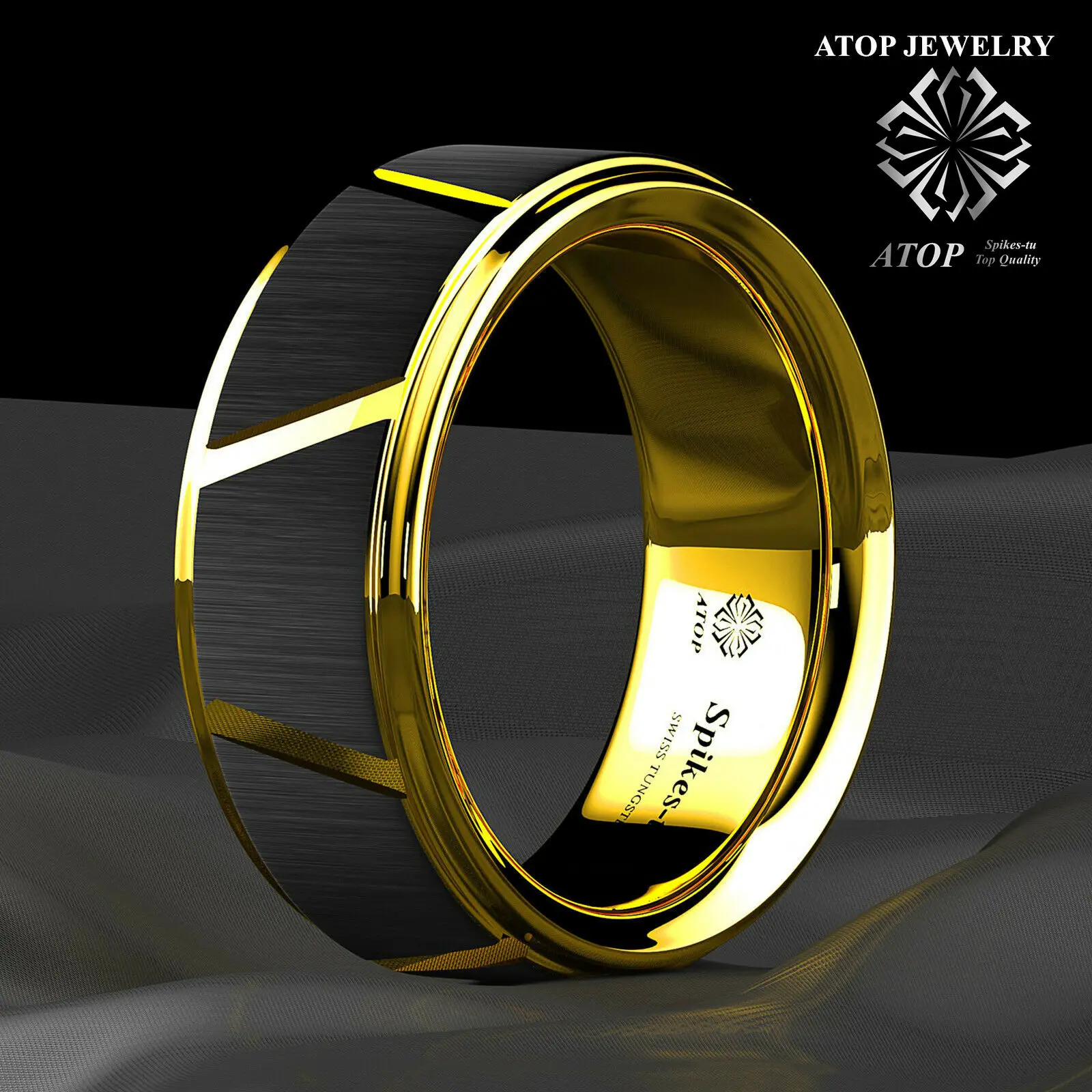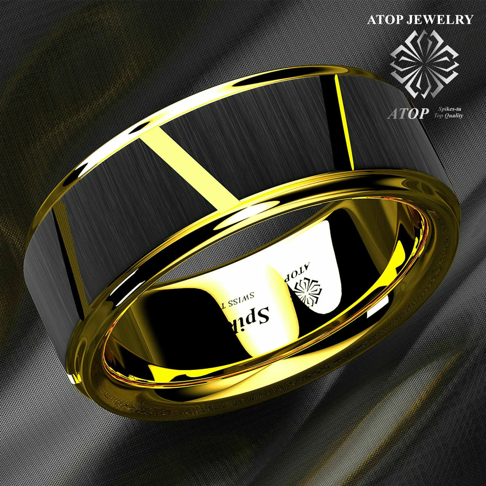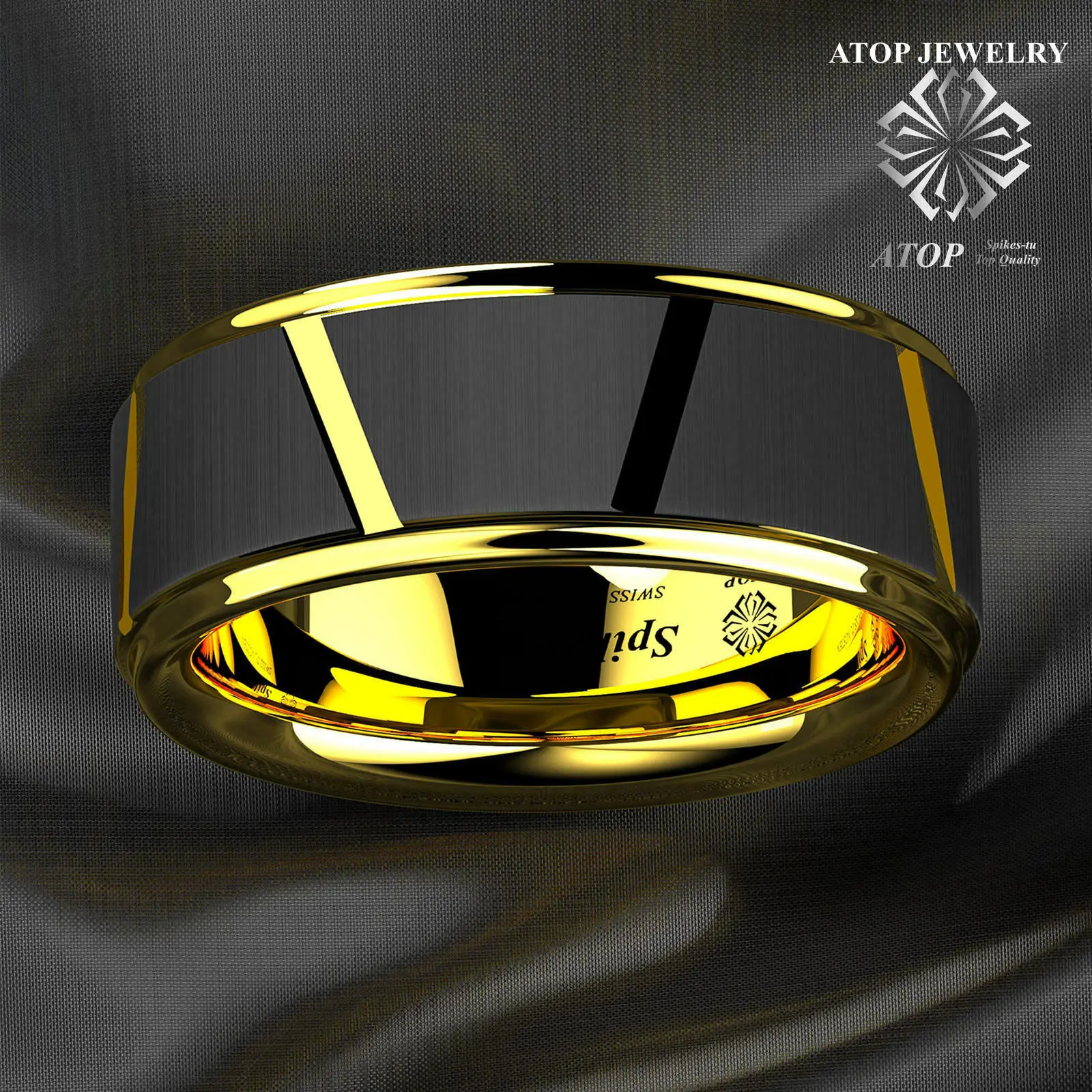8 черных ромбов полированное сверху вольфрамовое кольцо 18 К золото...