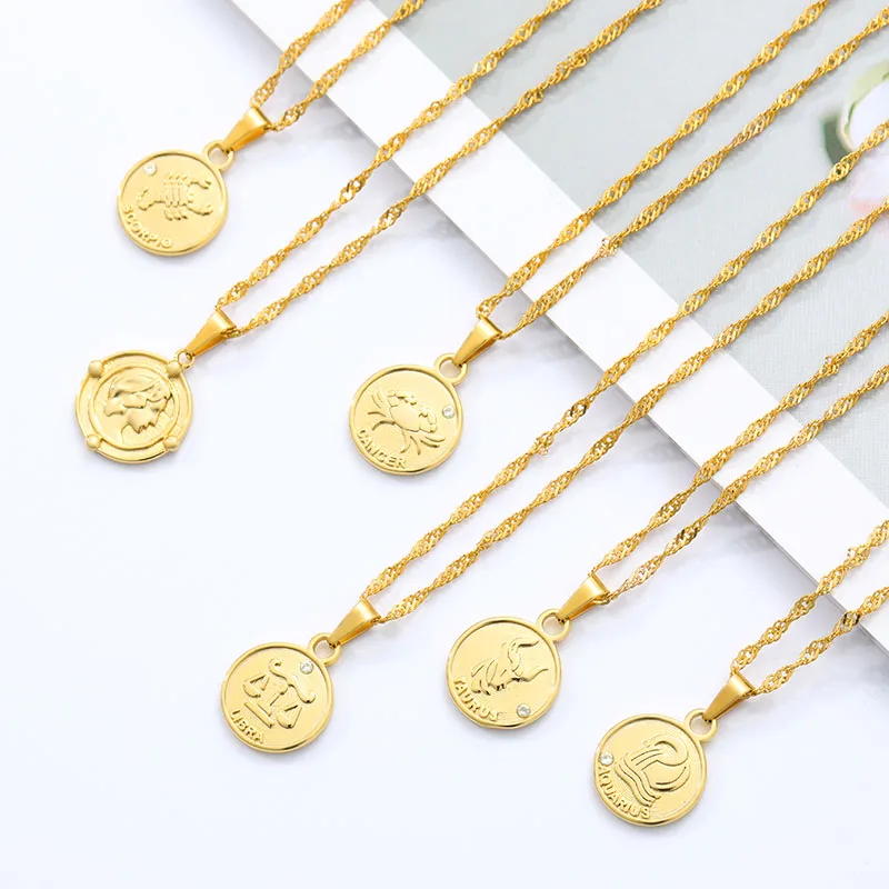 Мода 12 Созвездие монеты ожерелья Созвездие Лев/Скорпион/Водолей Кулон волна воды цепь Золотой Цвет Ожерелье