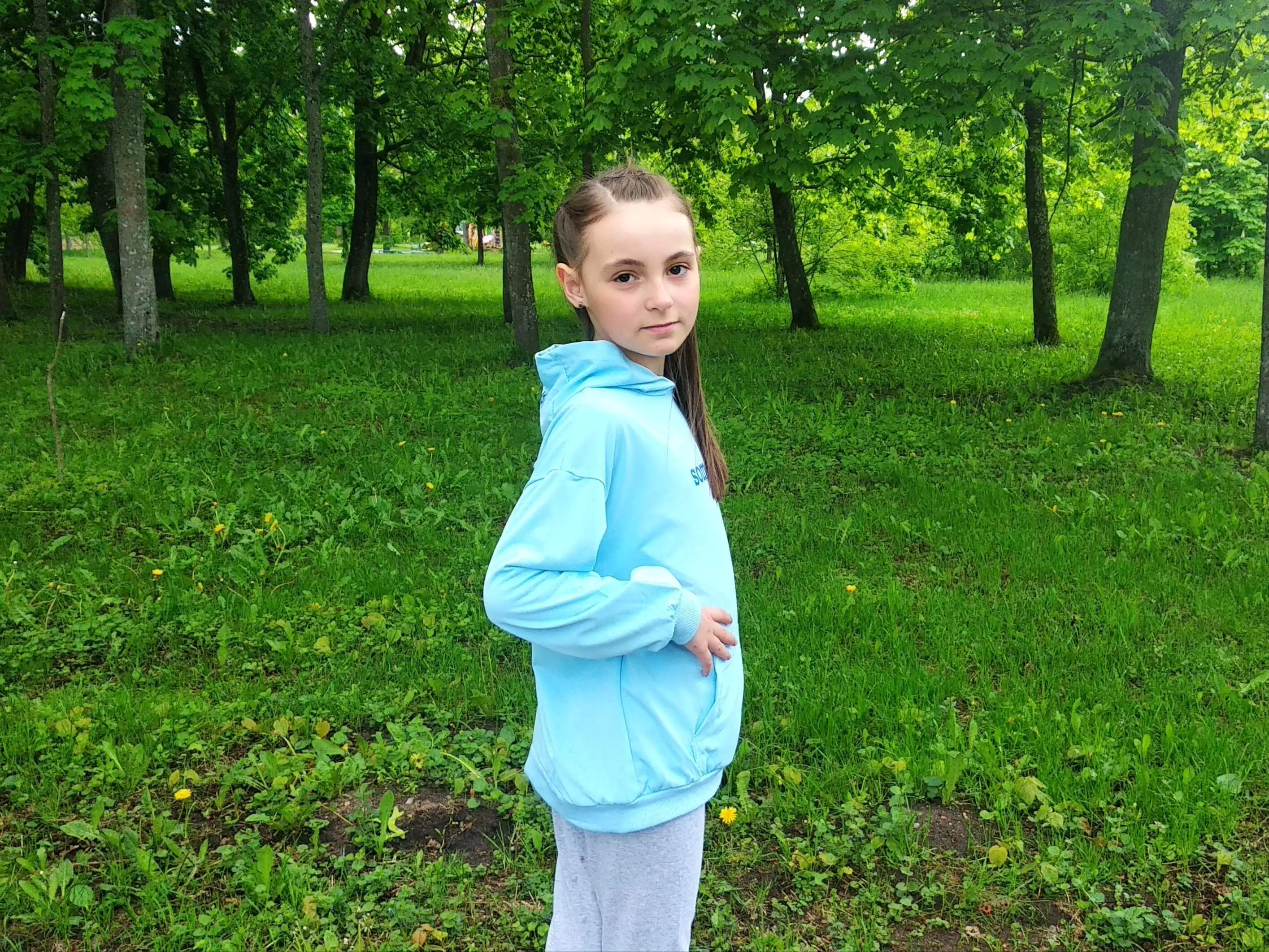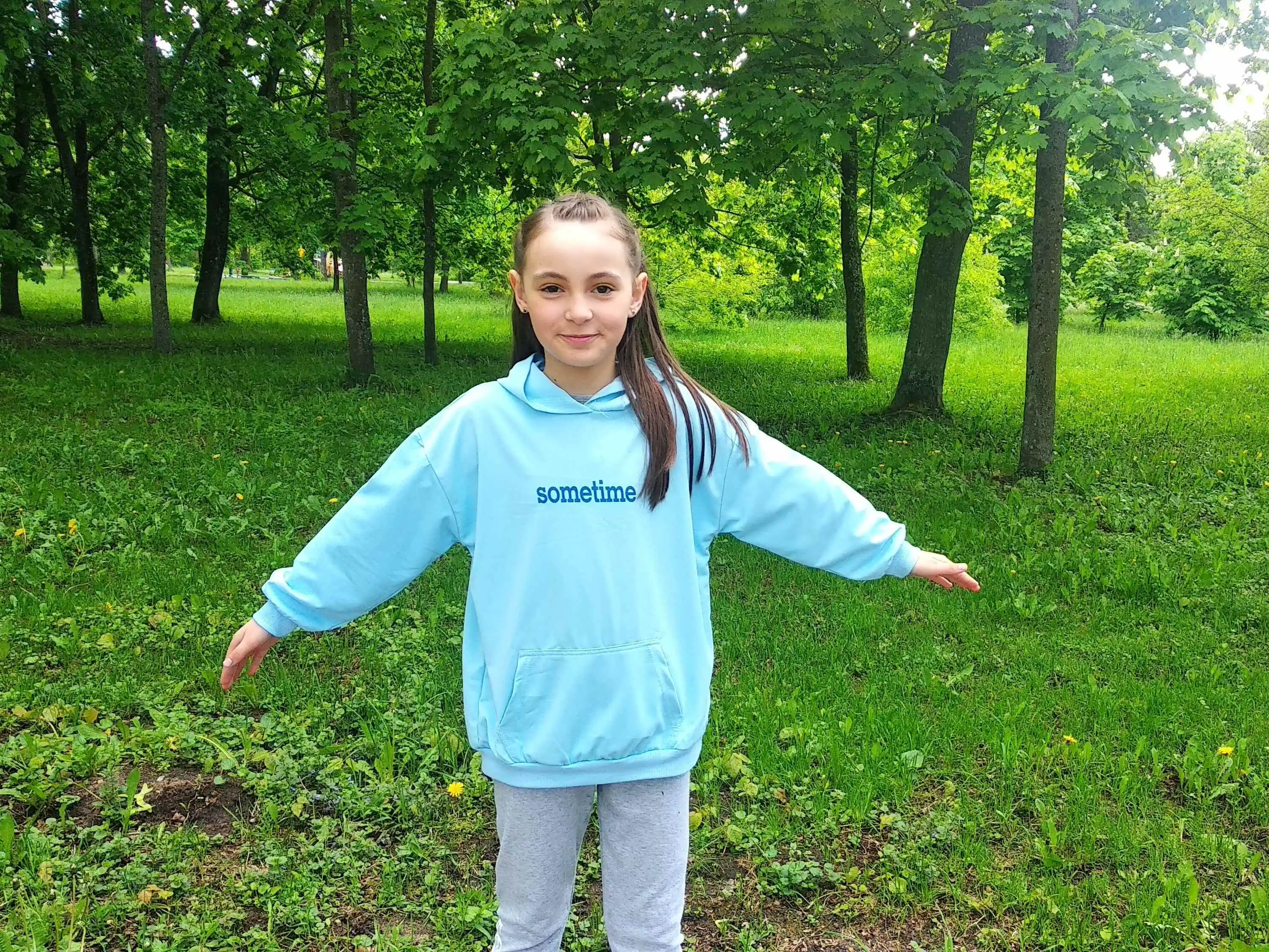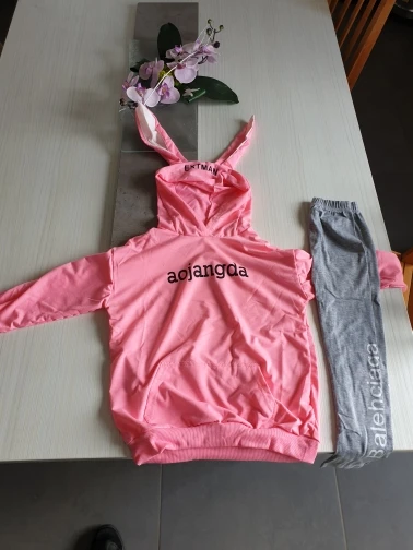 Очень классный комплект, жаль, что из полиэстера, но ткань приятная к телу . На рост дочки 137 см заказала размер 10 . На худи указан рост 140, а на леггах - 150 . В итоге, и верх и низ на дочку немного большеват . По этому легги мы отложили на следующий год, а худи дочка носит уже сейчас с другим низом, ведь кофты оверсайз сейчас в тренде .Качество изготовления отличное . Доставка заняла три недели до РБ .