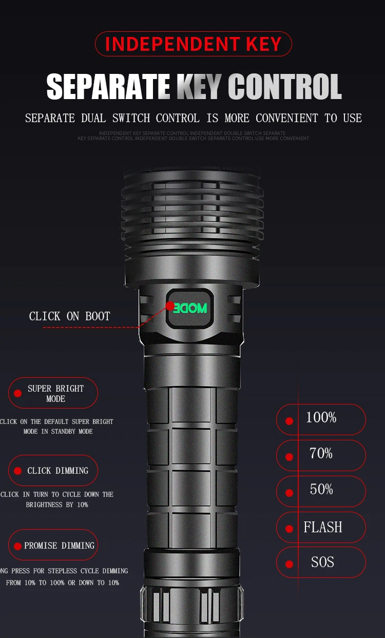 Мощный светодиодный фонарик с использованием лампы L2 светодиодный для максимальной выходной мощности до 30000 люменовУвеличьте 1*18650 аккумуляторный отсек, чтобы увеличить время работы.Дисплей емкости аккумулятора, телескопический зумМикро-usb для компьютера usb, Автомобильный USB, usb-разъем для зарядки, зарядный фонарикИзготовлен из авиационного алюминиевого сплава прочный HAIII военный класс Жесткий анодированныйВодонепроницаемый в соответствии с IPX-6, водостойкий, может использоваться в дождливую погоду, но не может положить его в водуПодходит для работы, охоты, альпинизма, рыбалки, кемпинга и активного отдыха и т. д.Ударопрочный до 2 метров