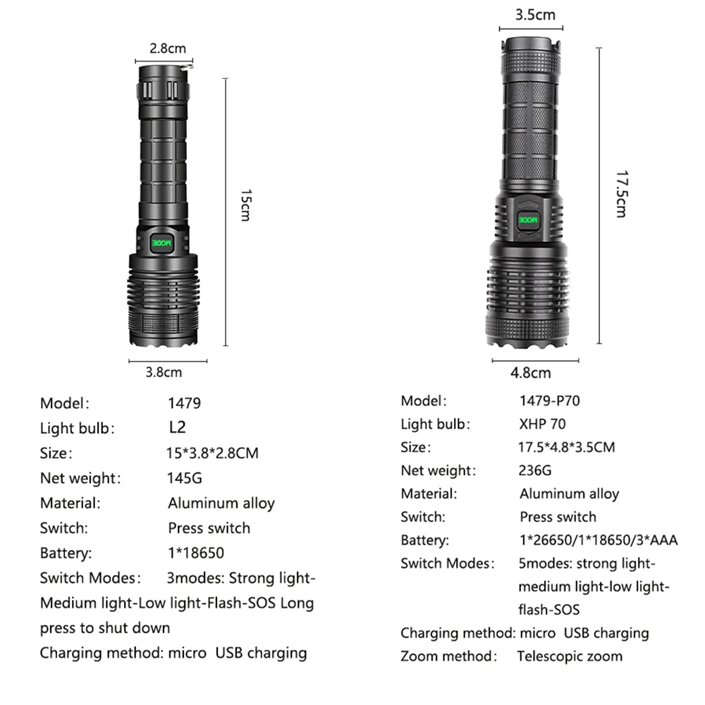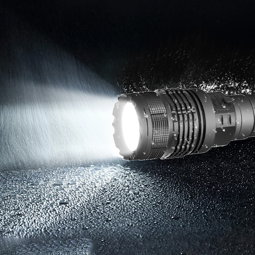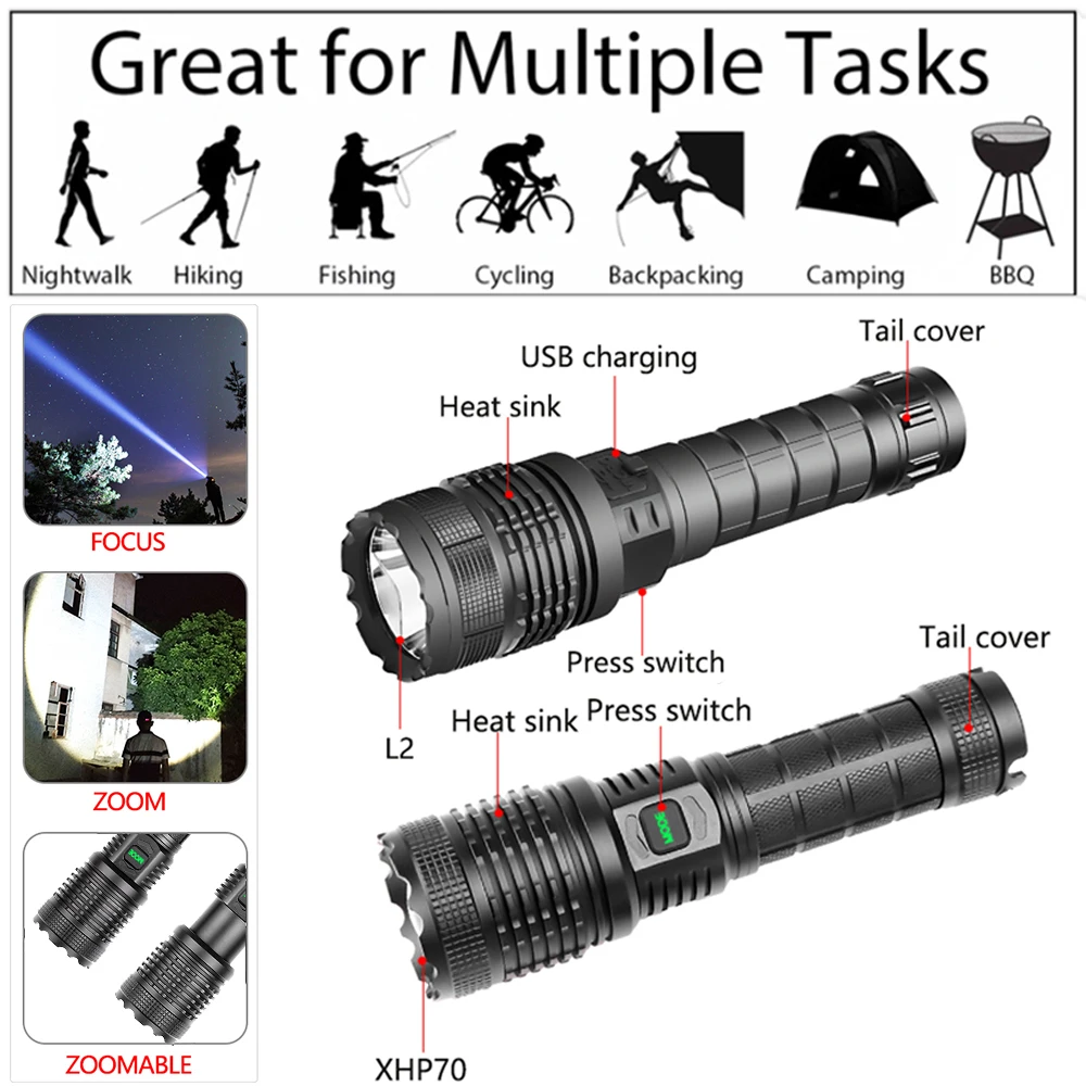 Мощный светодиодный фонарик с использованием лампы XHP70.2 светодиодный фонарик с максимальной мощностью до 7000 люменовУвеличьте 1*18650 аккумуляторный отсек, чтобы увеличить время работы.Дисплей емкости аккумулятора, телескопический зумМикро-usb для компьютера usb, Автомобильный USB, usb-разъем для зарядки, зарядный фонарикИзготовлен из авиационного алюминиевого сплава прочный HAIII военный класс Жесткий анодированныйВодонепроницаемый в соответствии с IPX-6, водостойкий, может использоваться в дождливую погоду, но не может положить его в водуПодходит для работы, охоты, альпинизма, рыбалки, кемпинга и активного отдыха и т. д.Ударопрочный до 2 метров