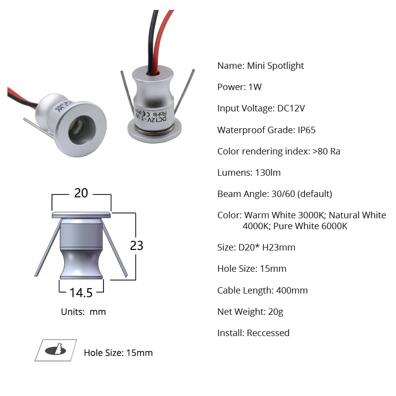Просветильник светильник Точечный светодиодный, 1 Вт, 12 В, 20 шт.