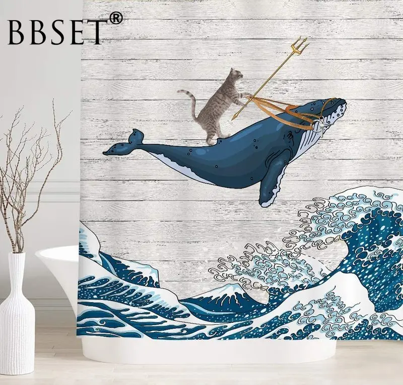 Забавная Водонепроницаемая занавеска для душа с изображением кошки, наездника, Кита, морских волн, разных размеров, Кортина-де-Бано, декор для ванной комнаты с крючками