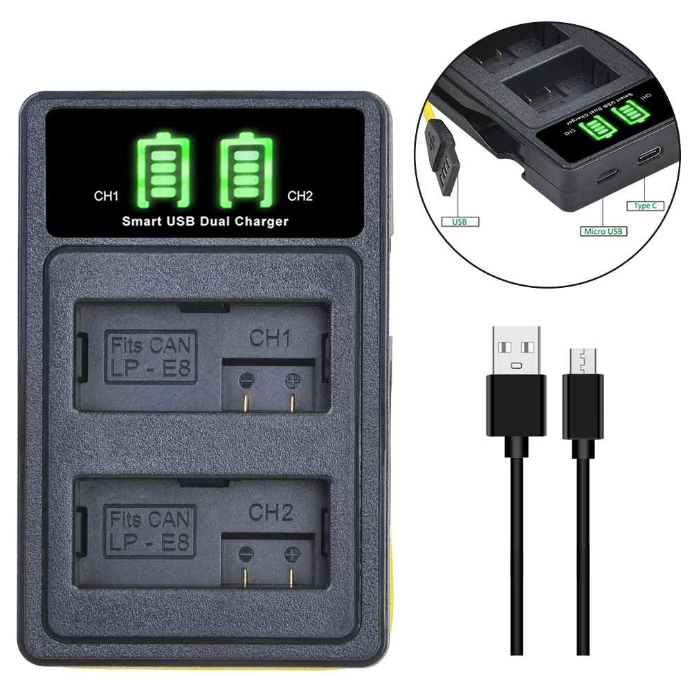 Аккумулятор 1800 мАч LP-E8 LP E8 + зарядное устройство со светодиодной подсветкой и портом Type-C для Canon EOS 550D 600D 650D 700D kiss X4 X5 X6i X7i Rebel T2i T3