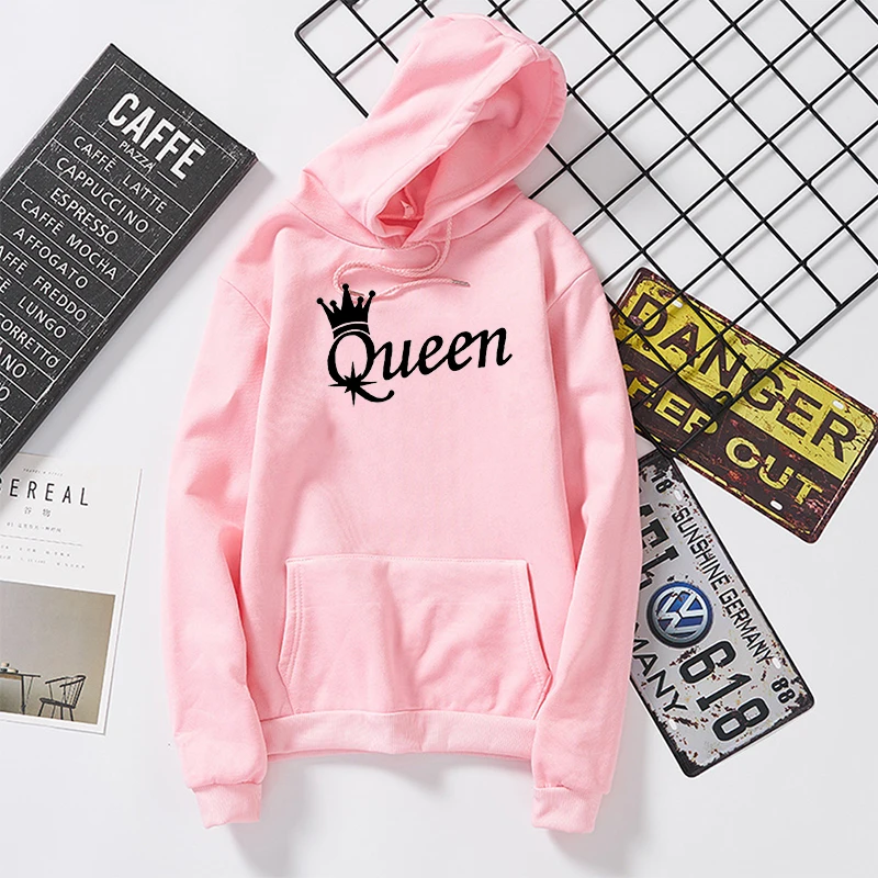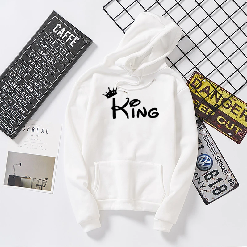 Толстовка с капюшоном для мужчин и женщин, уличная одежда с принтом короны и короны, KING Queen, свитшот с длинным рукавом, Зимний пуловер с капюшоном для влюбленных